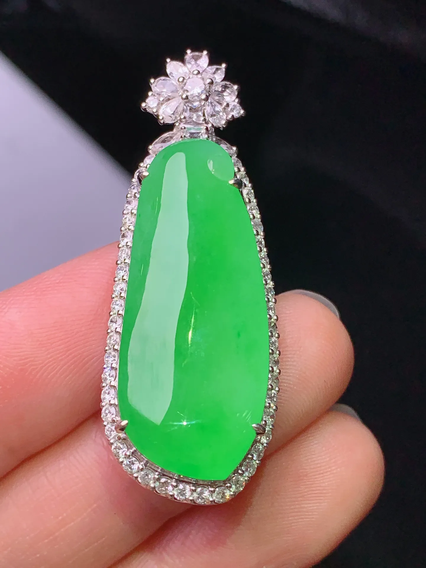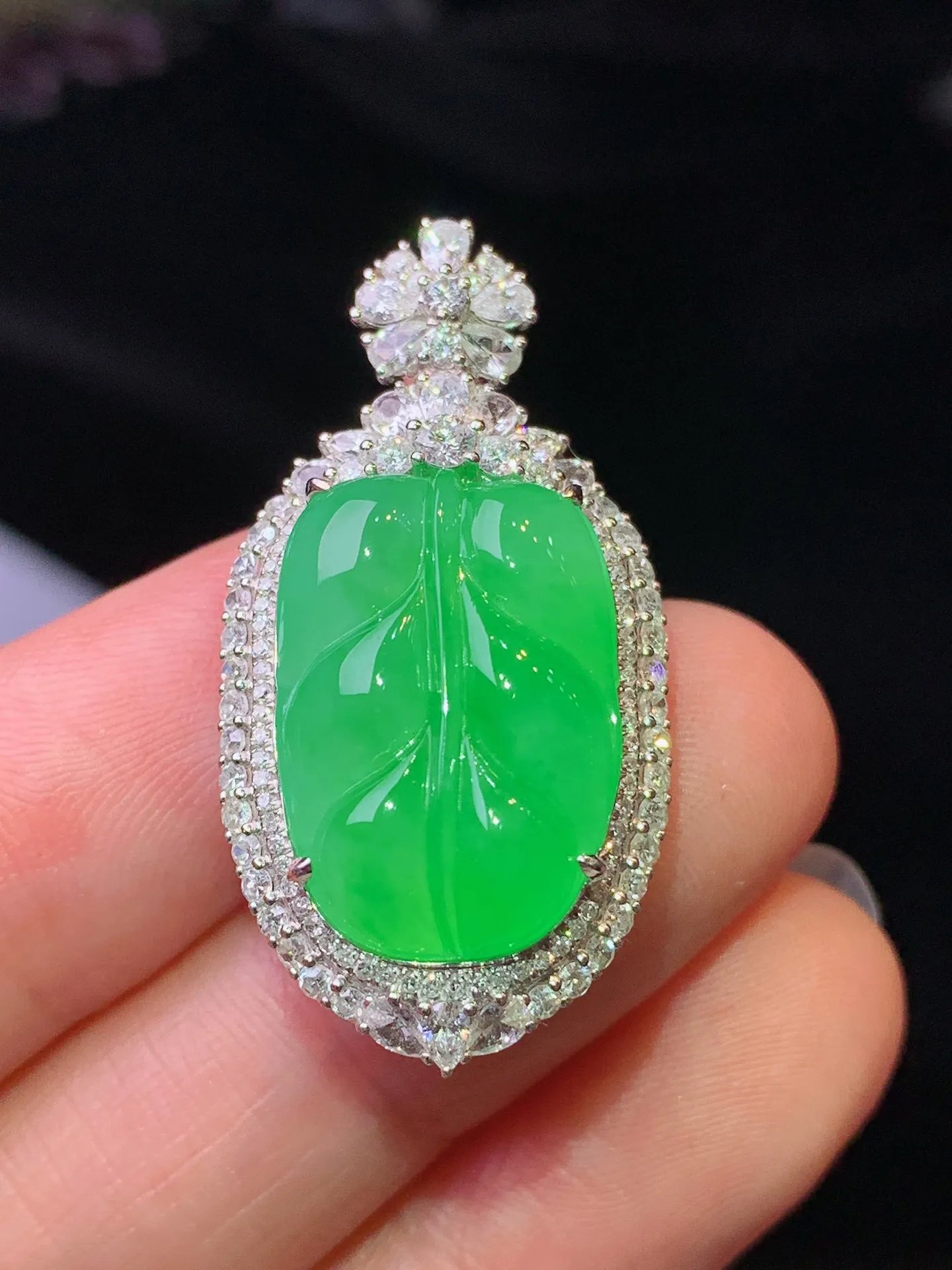 18k金钻镶嵌翠绿树叶吊坠 玉质细腻 色泽清新艳丽 整体尺寸34*17.5*11.8