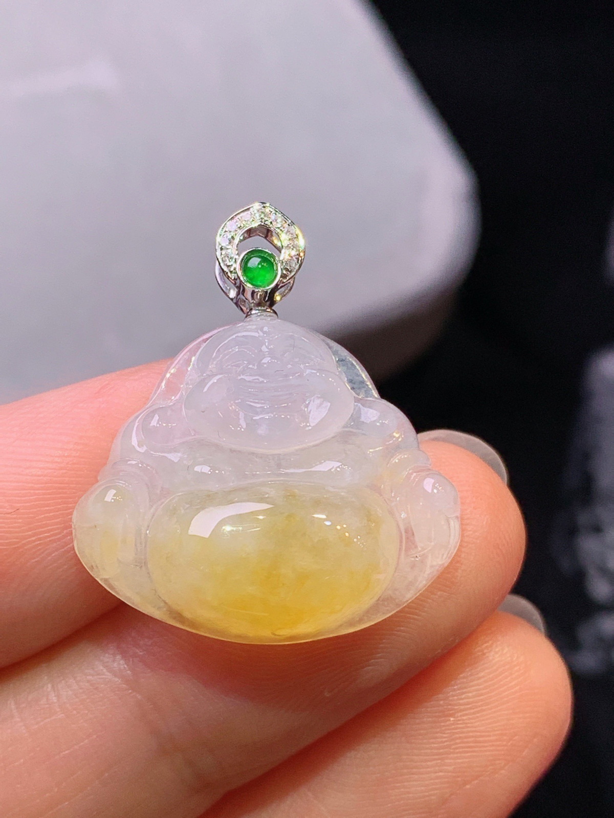 18k金钻镶嵌飘黄翡佛公吊坠 玉质细腻 色泽艳丽清新 b1整体尺寸25.5*22.5*6.5