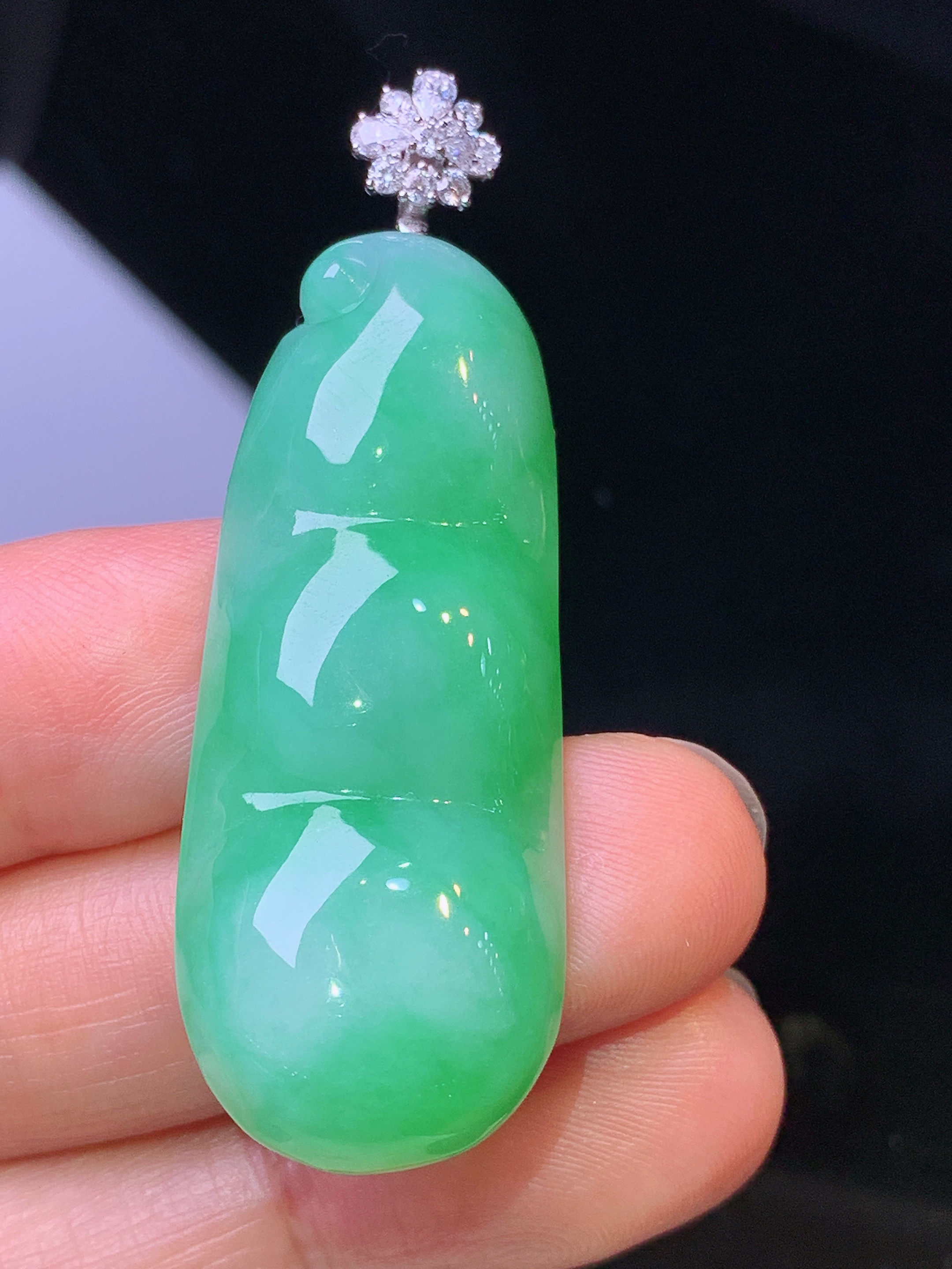18k金莫桑钻镶嵌翠绿四季豆吊坠 玉质细腻 色泽艳丽 整体尺寸50.5*16.7*7.3j1