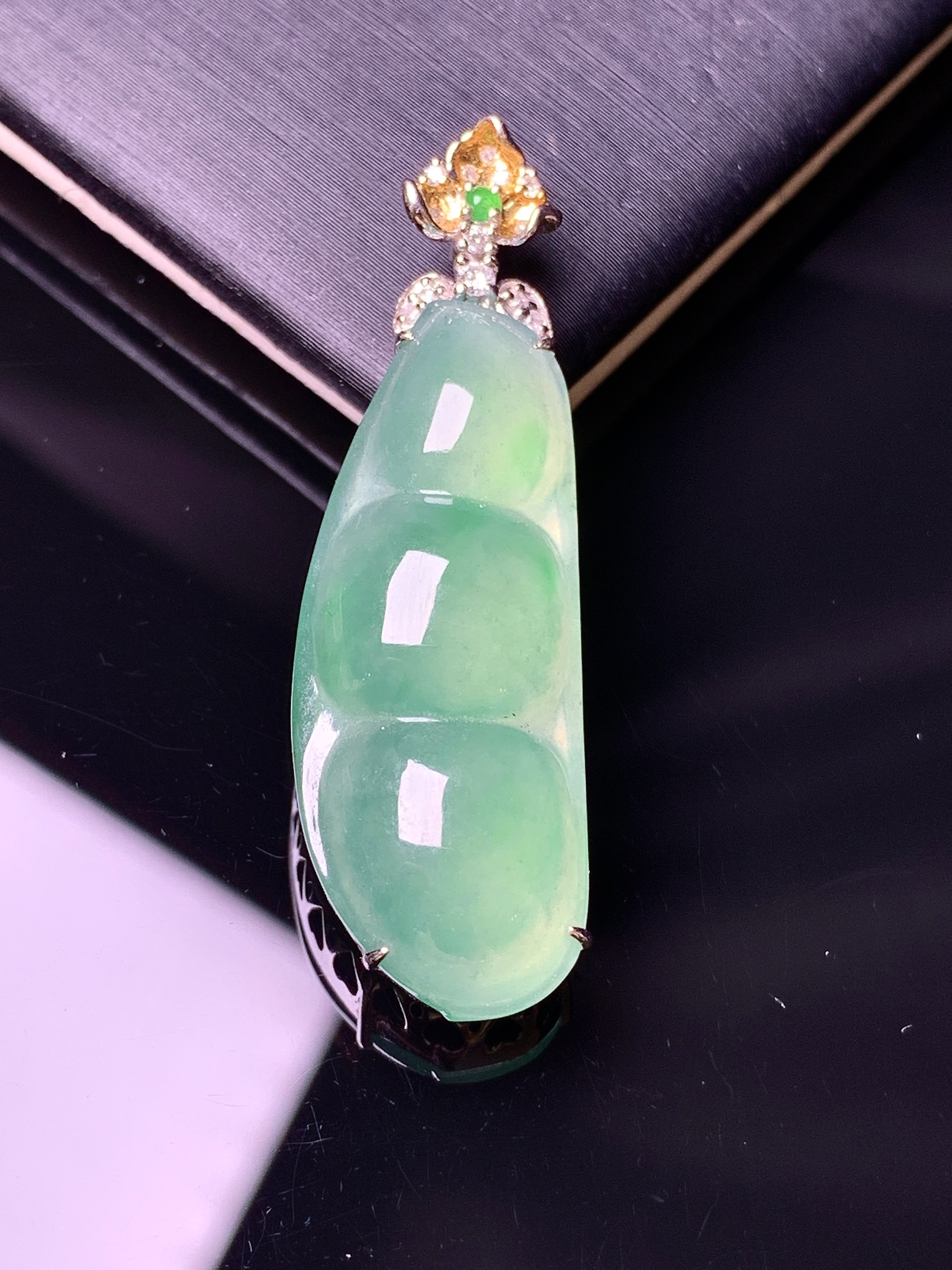 18k金钻镶嵌翠绿四季豆吊坠 玉质细腻 色泽艳丽 整体尺寸38.6*12*8yz