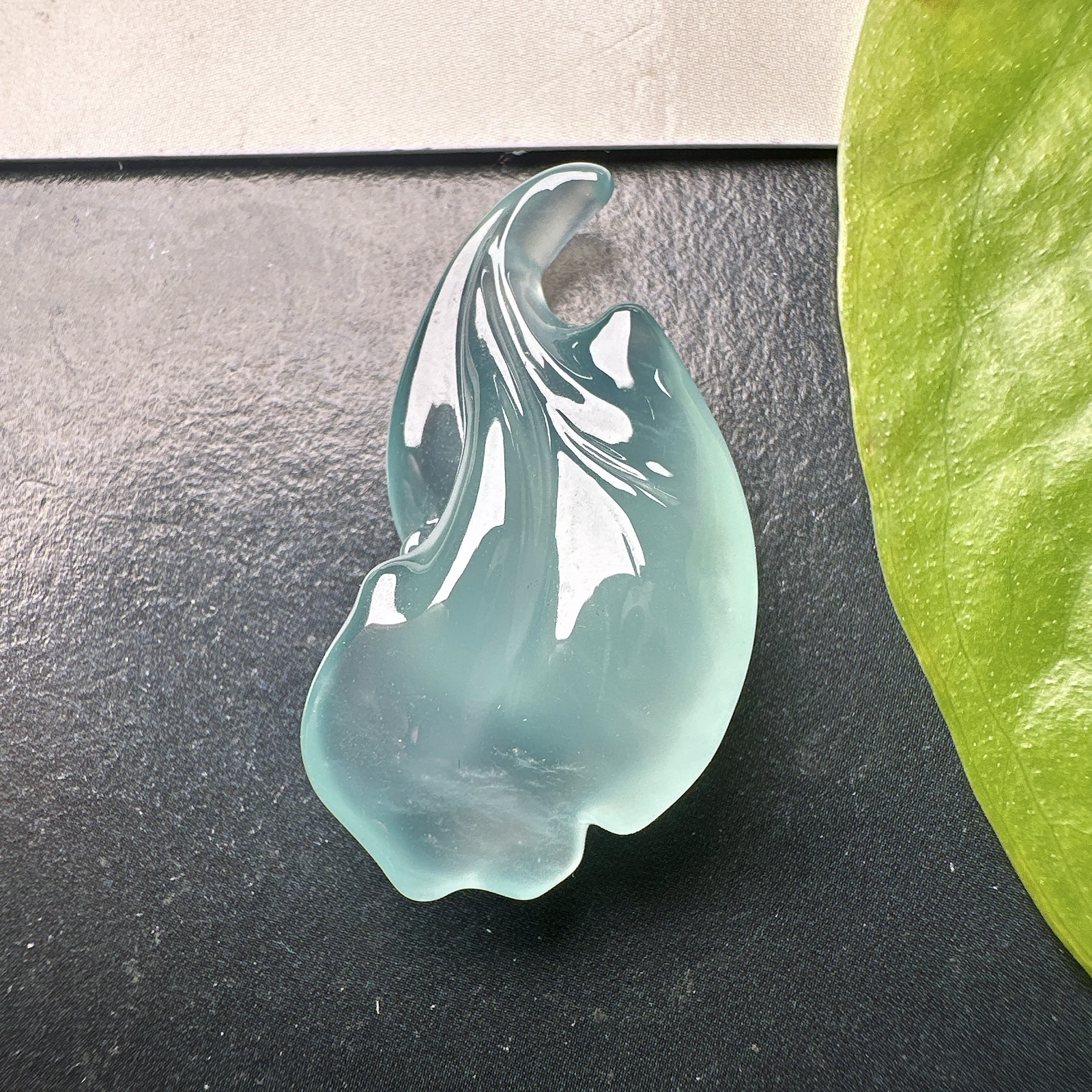 【冰种天空蓝随形裸石】随形银杏叶,质地非常细腻干净,冰润十足,种老冰透,收藏品质