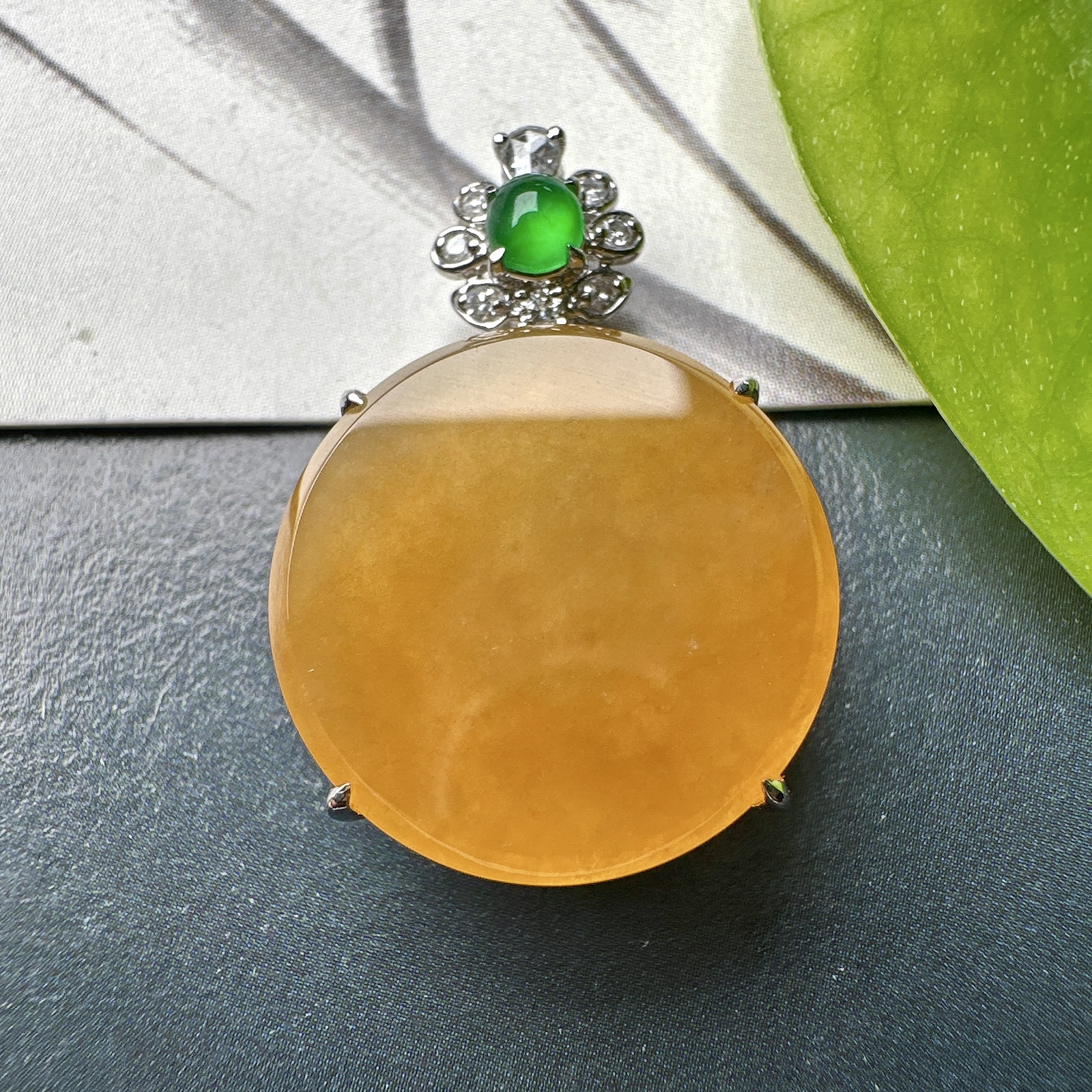 【冰种黄翡圆无事牌吊坠】质地细腻,冰润通透,晶莹闪亮。收藏品质,18k金钻镶嵌,裸石尺寸16.3*3