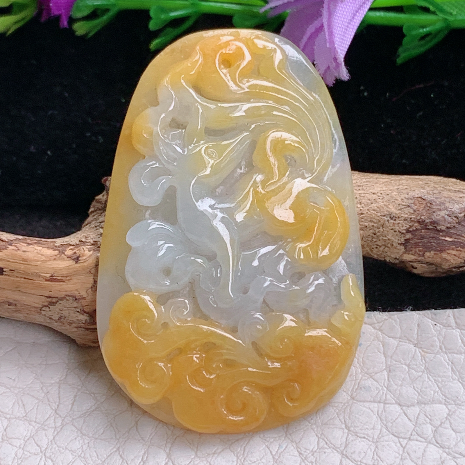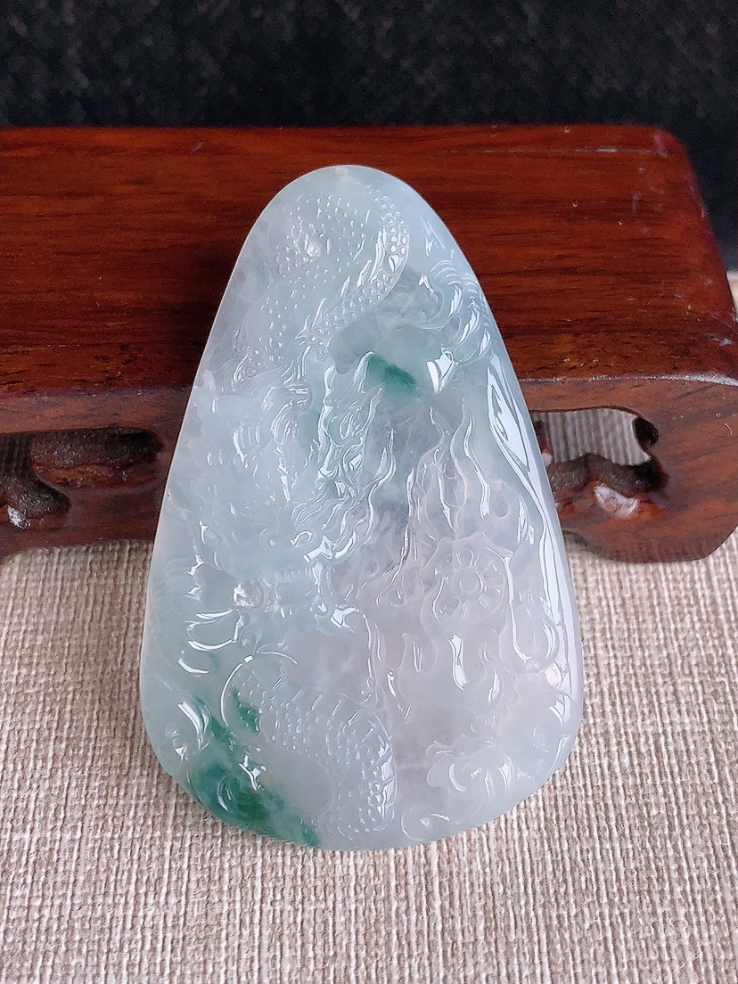 天然A货翡翠飘花龙牌吊坠 尺寸57.8-37-5.4mm 重量19.70g 0411