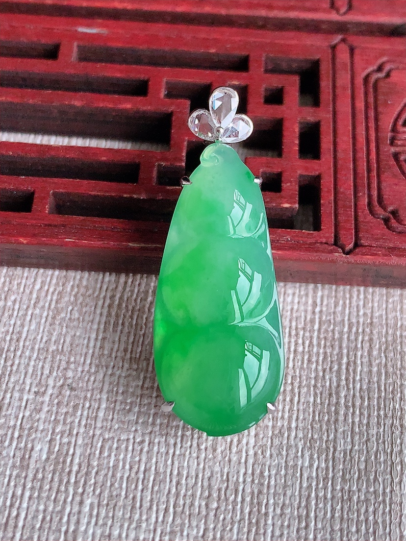 天然A货翡翠18K金伴钻镶嵌阳绿四季豆福豆平安豆吊坠 尺寸36-29.5-13.2-10.2mm
