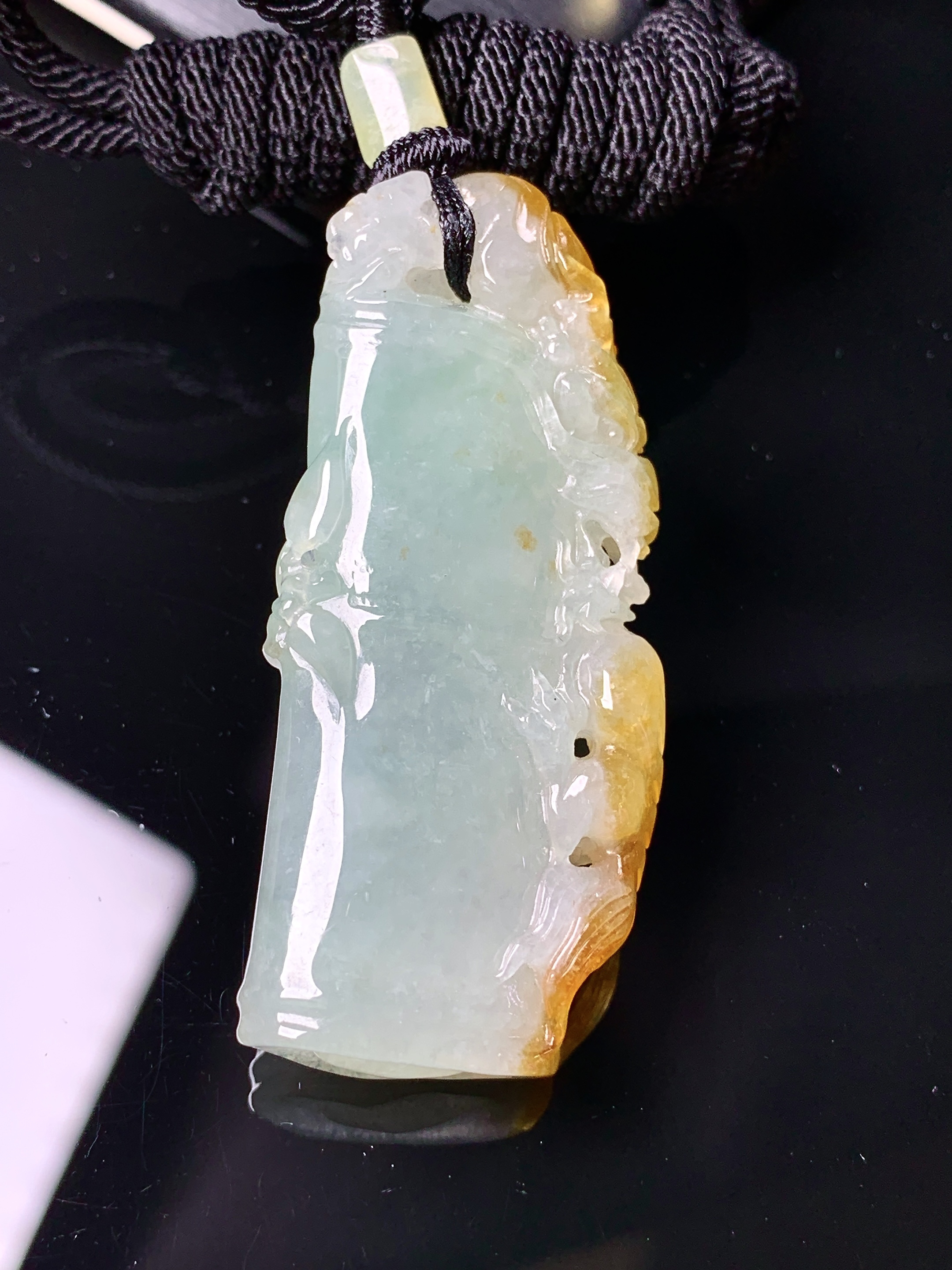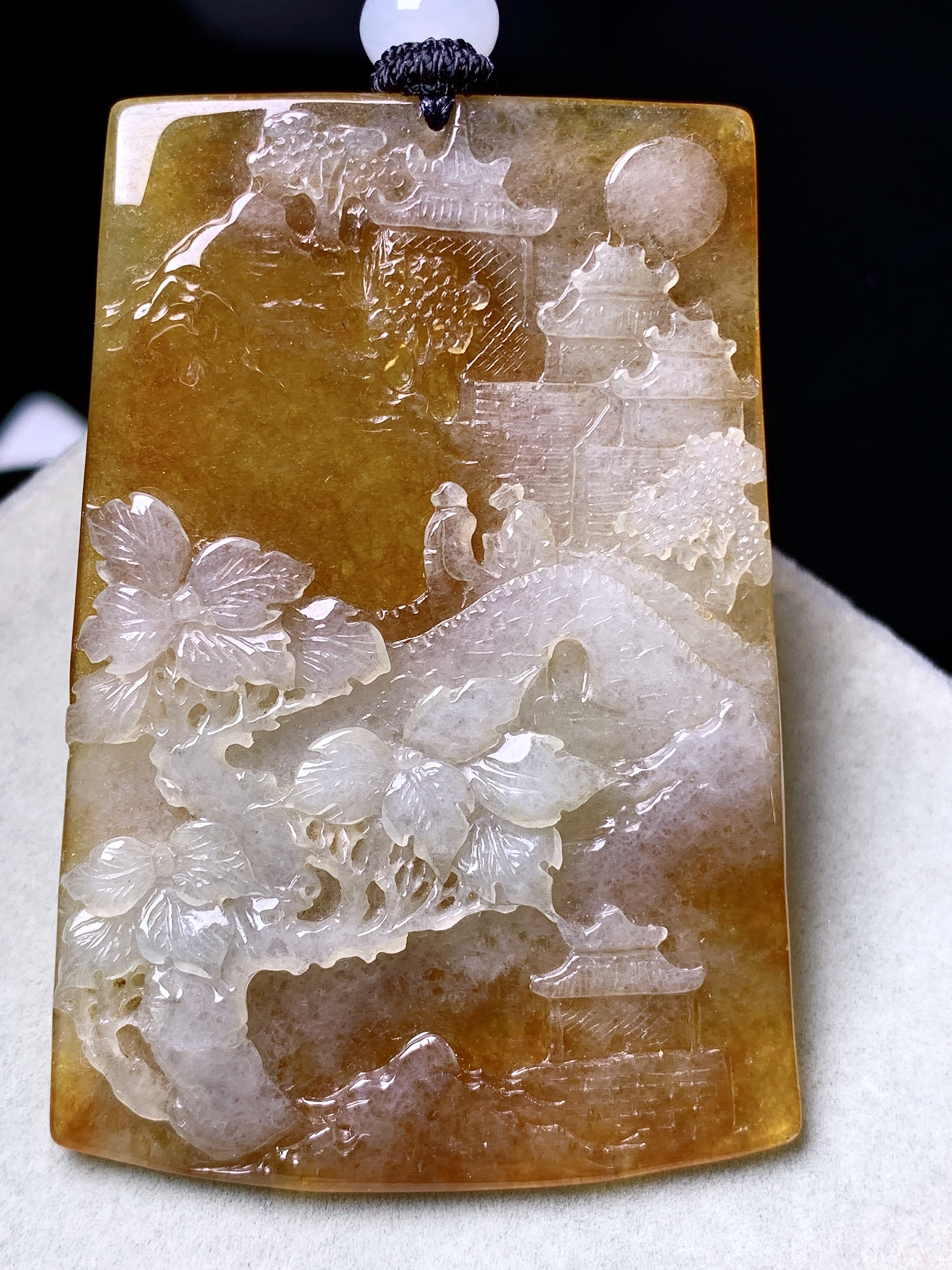 淡黄翡山水牌子吊坠 玉质细腻 色泽艳丽清新 水润亮眼 整体尺寸63.8*42.8*7.3L1