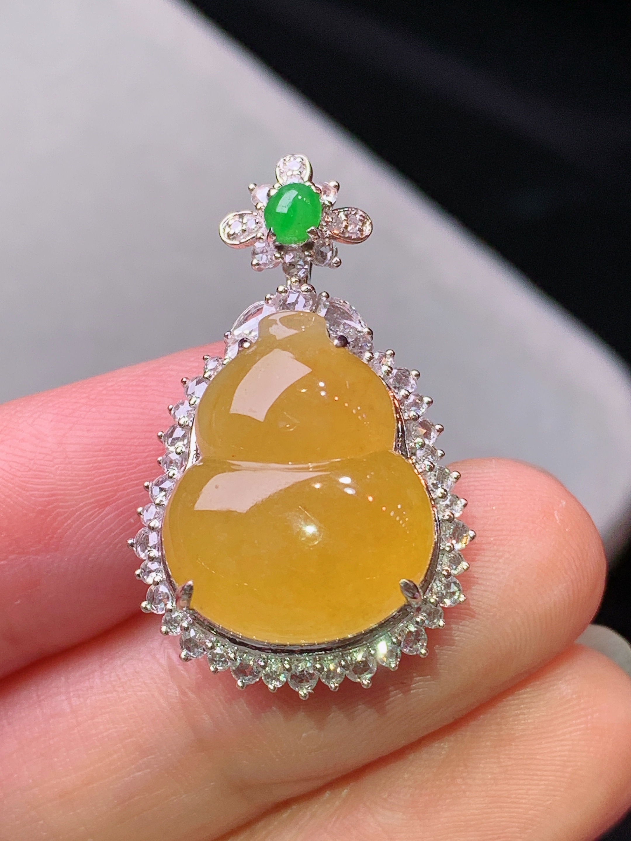 18k金钻镶嵌黄翡葫芦吊坠 玉质细腻 水润亮眼 色泽艳丽 整体尺寸29.8*18.5*11.8k1