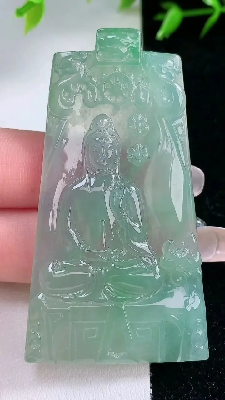 ws实拍66*50*12.2缅甸翡翠精雕清新双彩持莲观音玉吊坠 玉挂件