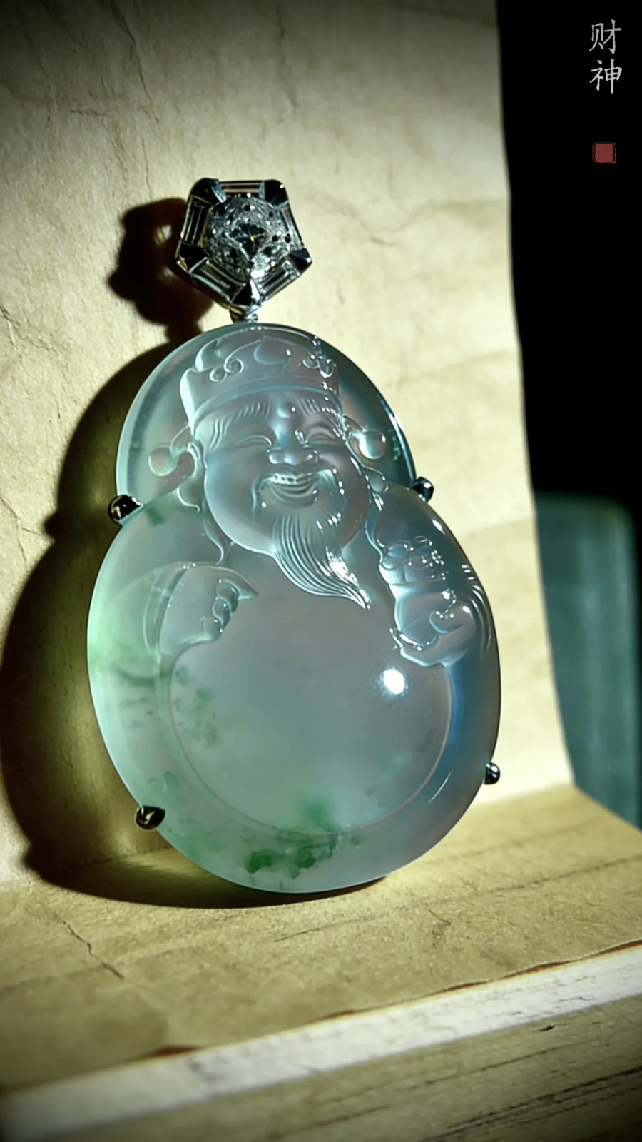 飘花【财神爷】,凝萃一方澄澈玉, 莹润通透如揽春溪在怀,花色轻拂似藏烟雨朦胧。 笑面财神笑意融,携福