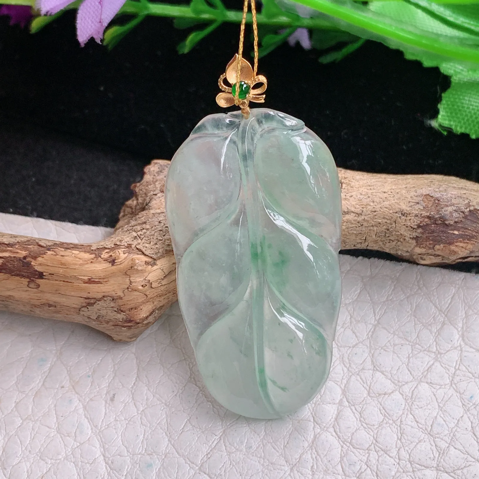 ws实拍36.8*21*3.8缅甸翡翠精雕清新冰飘绿花叶子 金枝玉叶玉吊坠 玉挂件