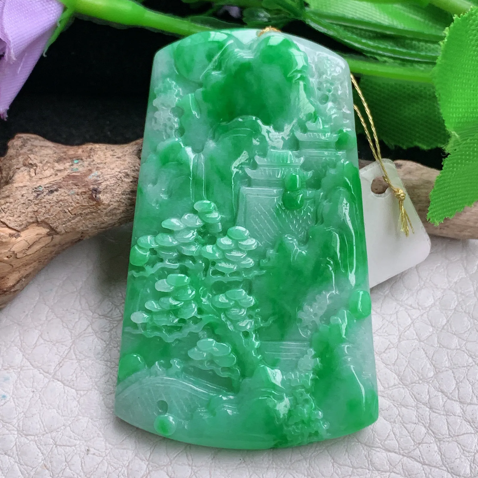 ws实拍55.3*33.5*4.5缅甸翡翠精雕辣绿山水 大好河山玉吊坠 玉挂件