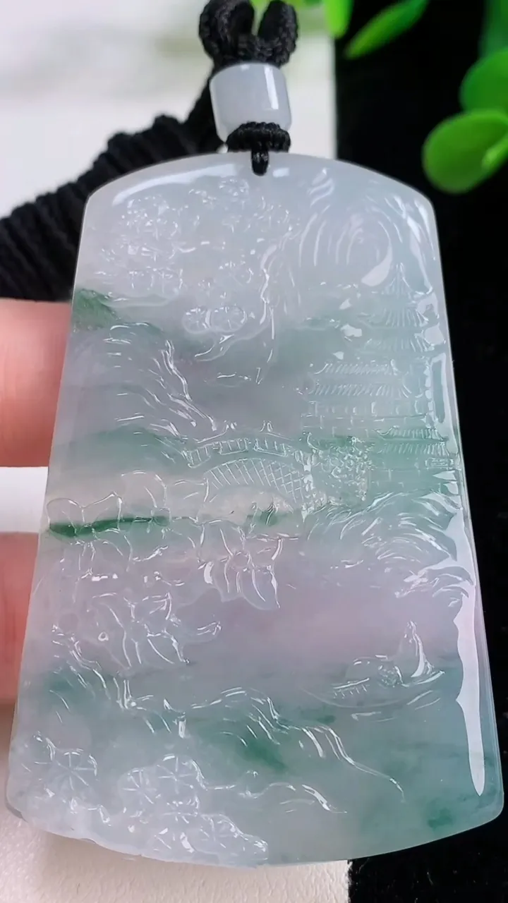 天然A货翡翠种飘花山水牌吊坠,尺寸64-41.4-5.4,重量:40.36g 11月25日
