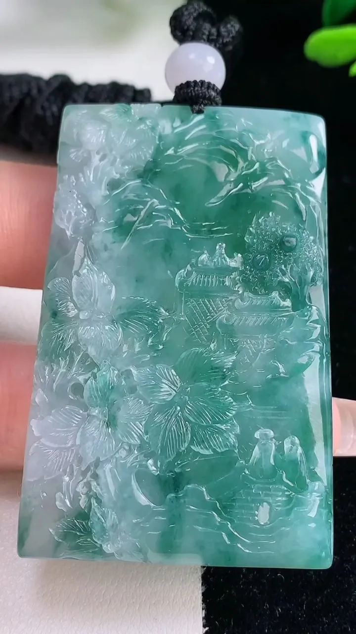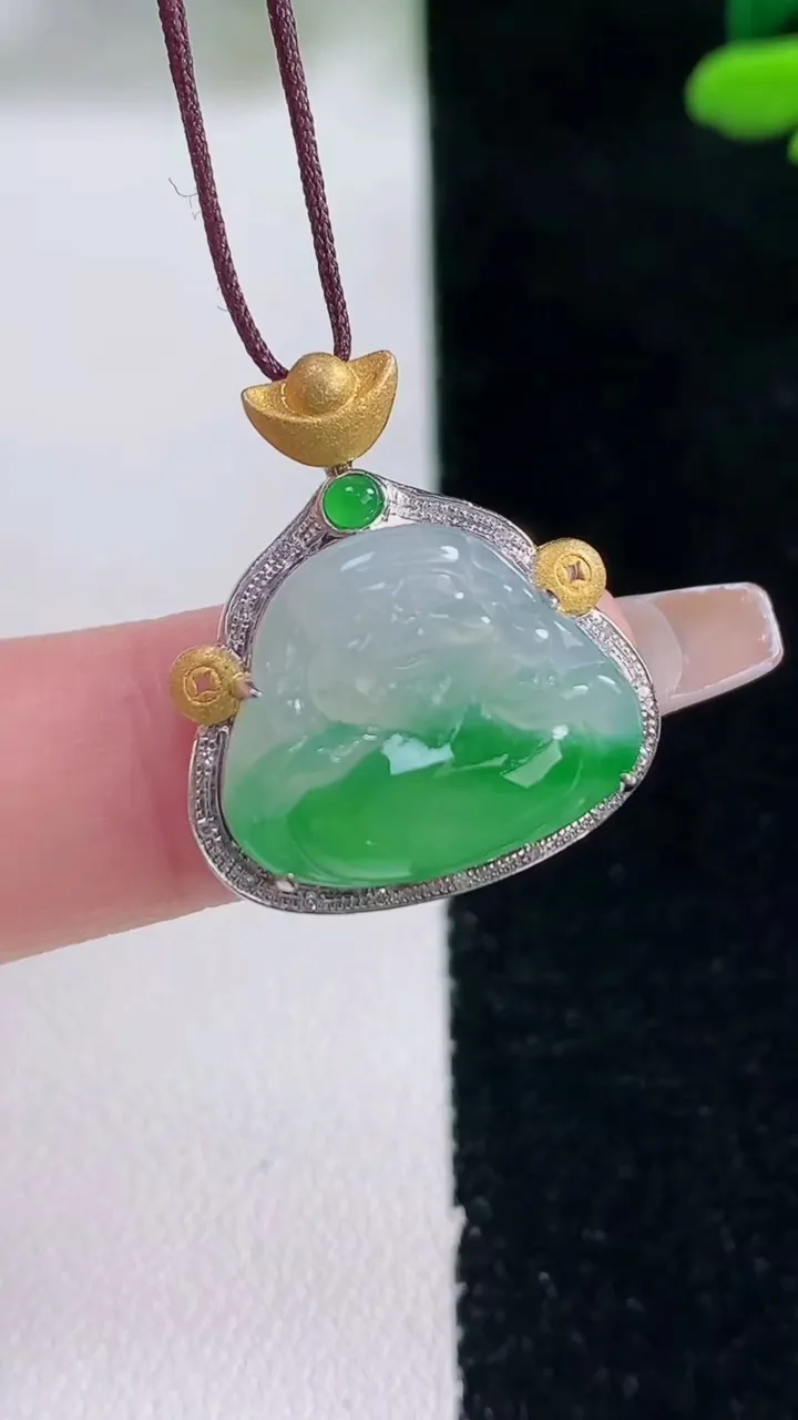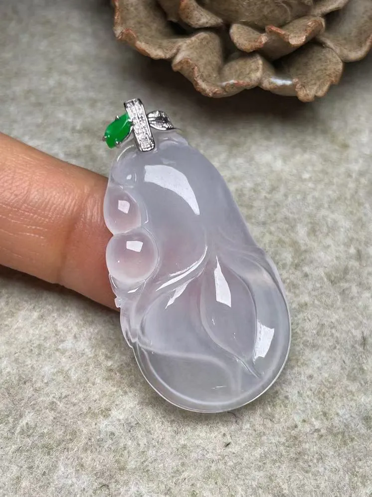 镶嵌款 飘绿四季豆吊坠 玉质细腻 色泽清新艳丽 整体尺寸37.5*17.3*4