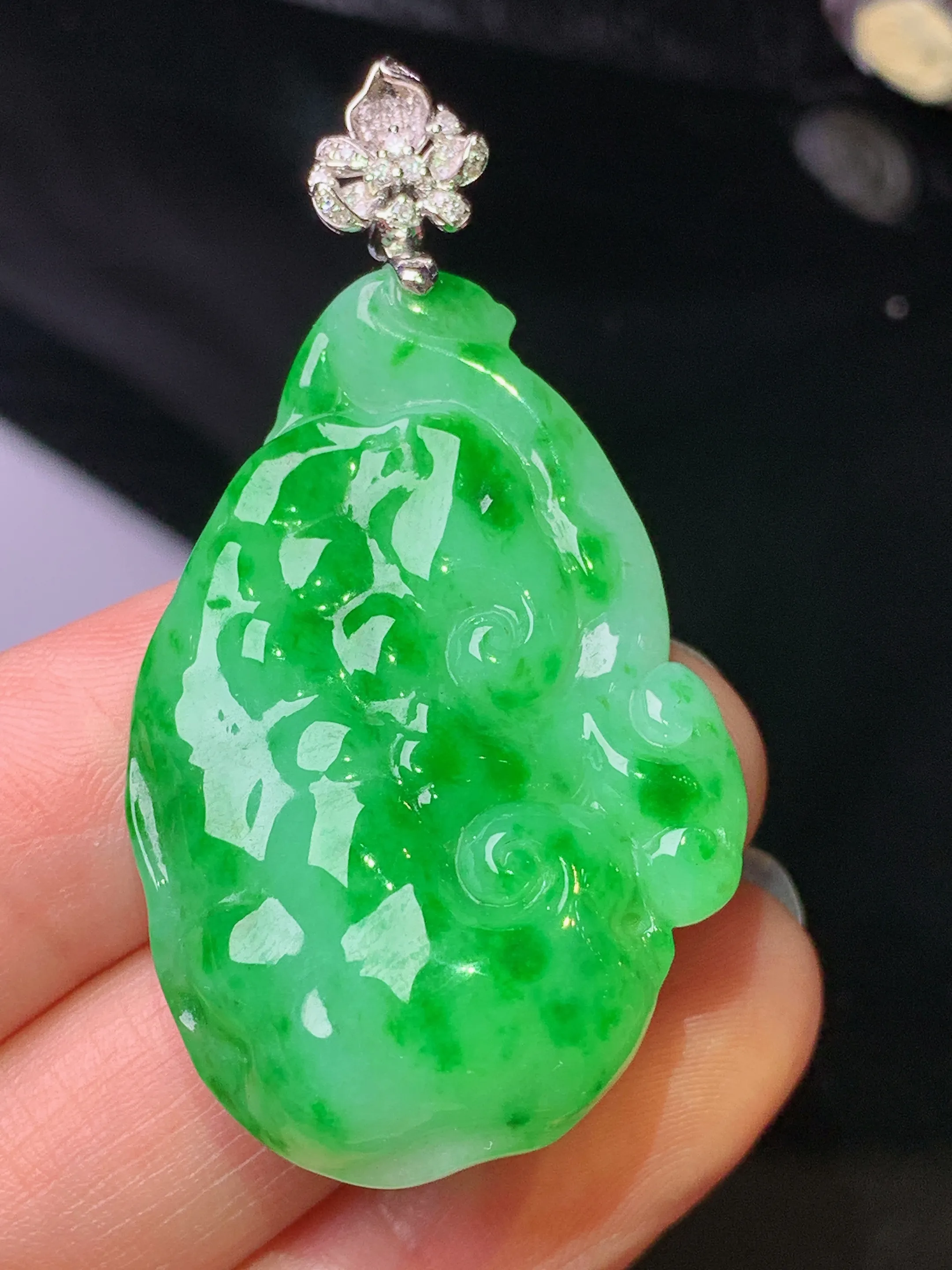 18k金钻镶嵌翠绿如意吊坠 玉质细腻 色泽清新艳丽 整体尺寸49.2*26.3*9.5