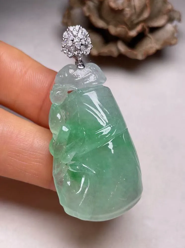 18K金镶嵌冰种满色翡翠叶子吊坠 ,种水足,色泽清新,工艺精湛,叶子寓意美好;金枝玉叶,事业有成。#