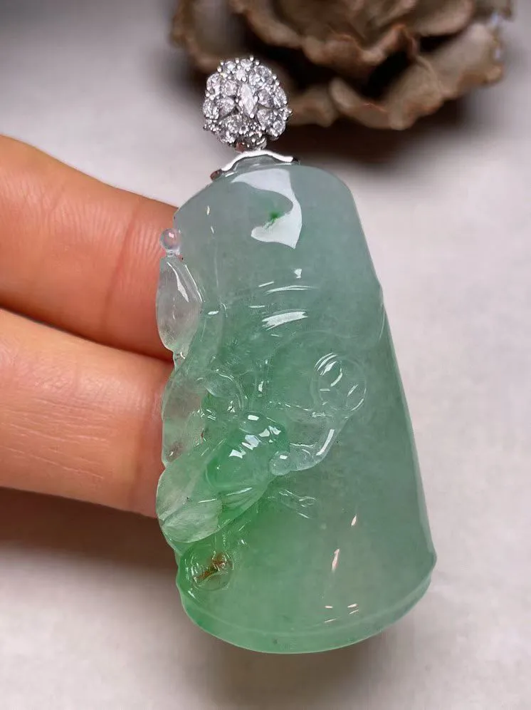 自然光实拍,18K金镶嵌冰种翡翠佛公吊坠,冰透饱满, 佛公亦保平安,寓意有福(佛公)相伴,品相佳,配