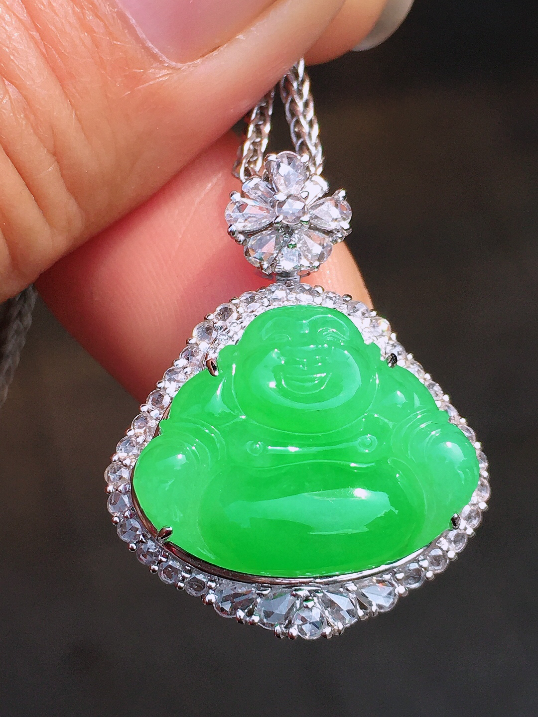 阳绿佛公吊坠,色泽均匀艳丽,玉质细腻,荧光感超 强,饱满圆润,尽显优雅气质,18k 金豪华镶嵌