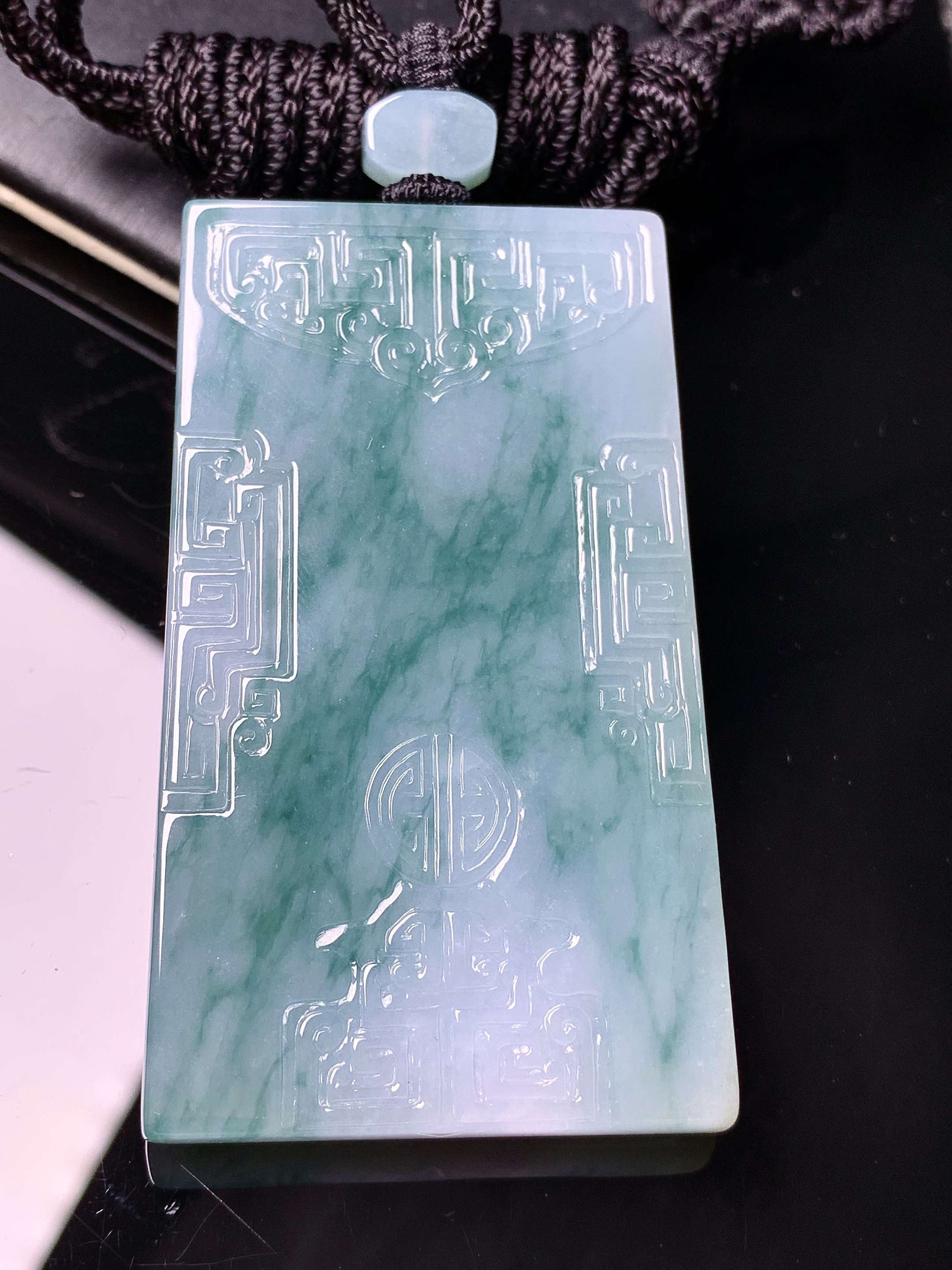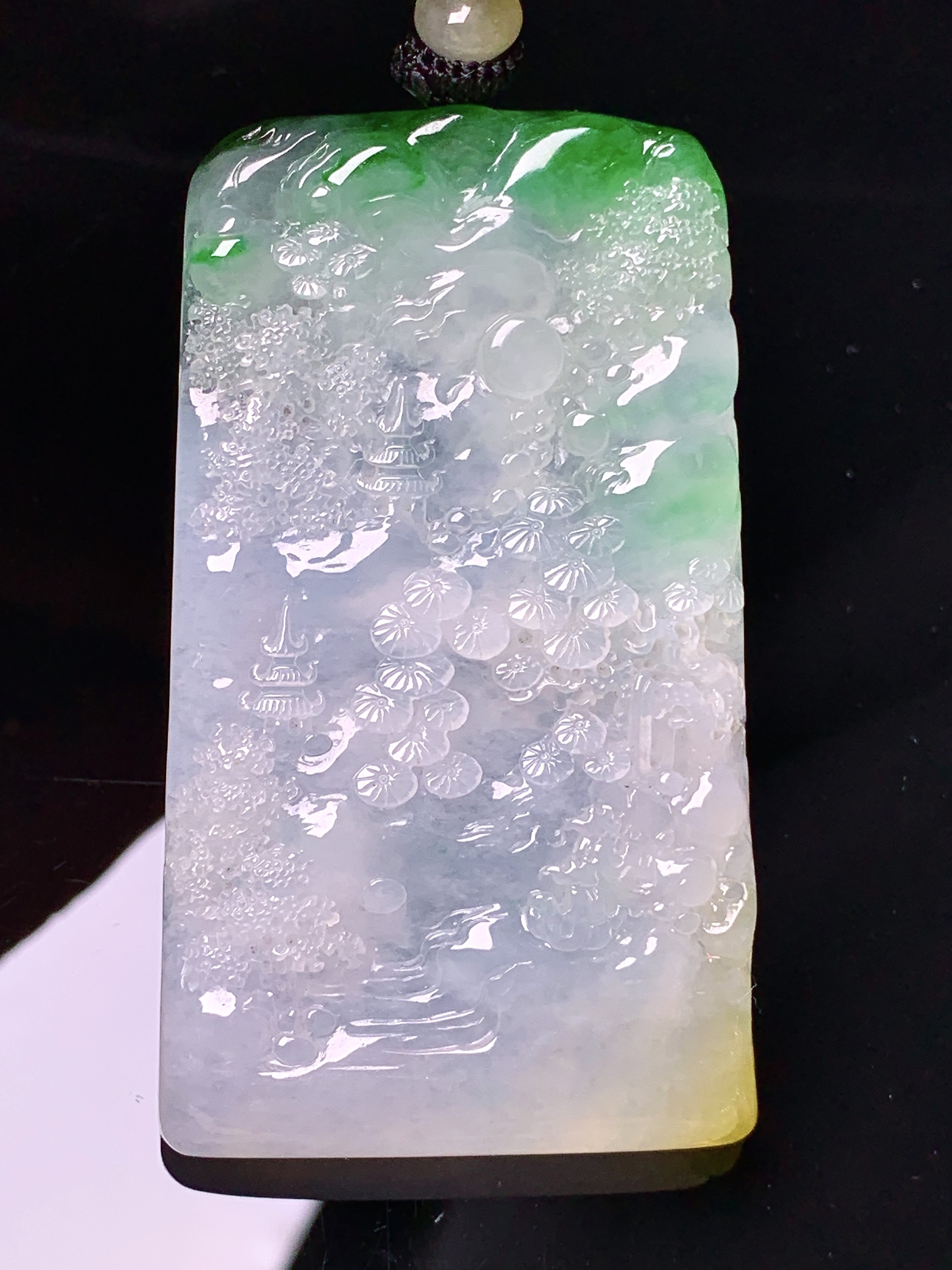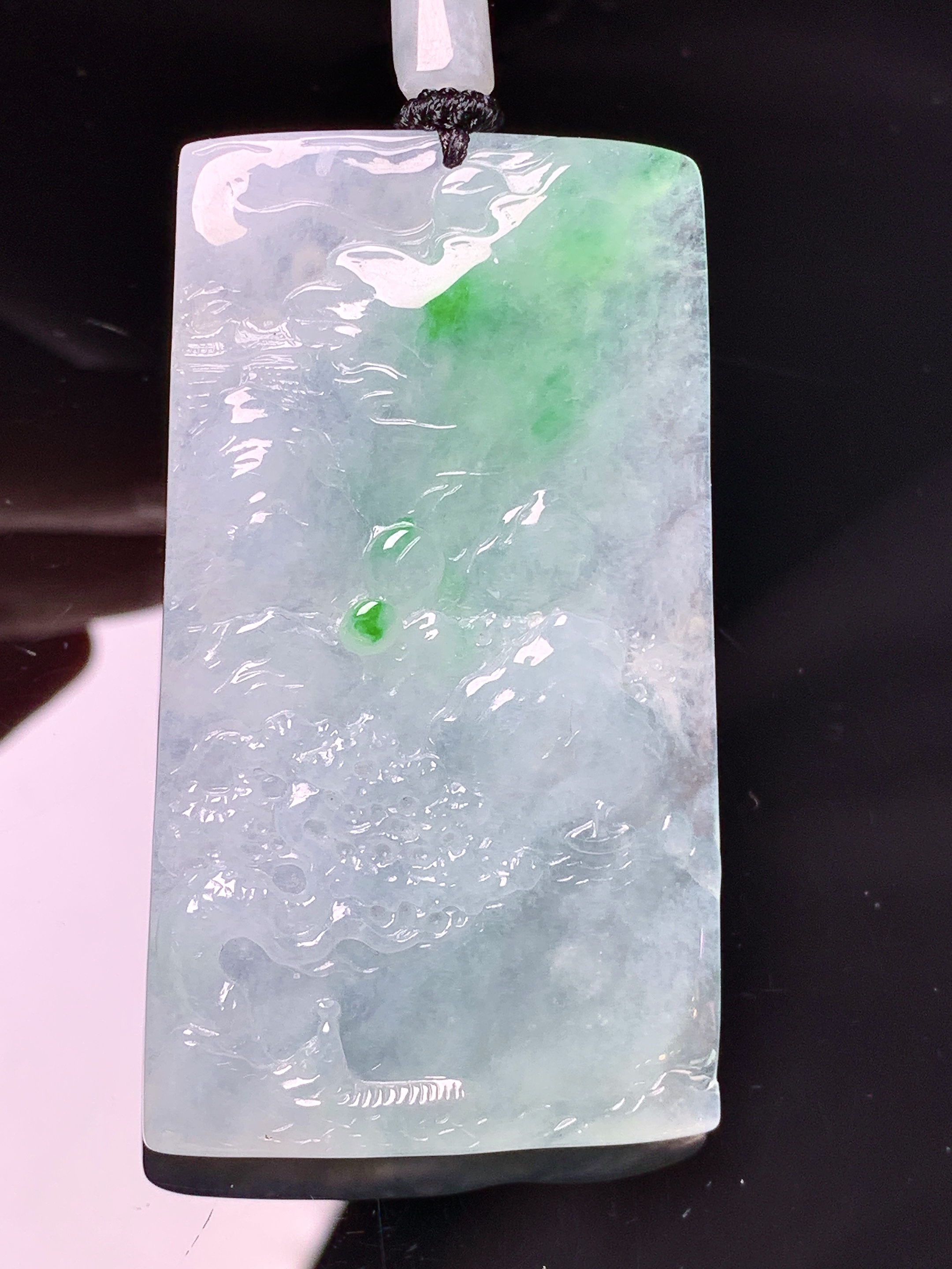 飘绿山水牌子吊坠 玉质细腻 色泽艳丽清新 水润亮眼 整体尺寸58.5*33.3*5.3L1