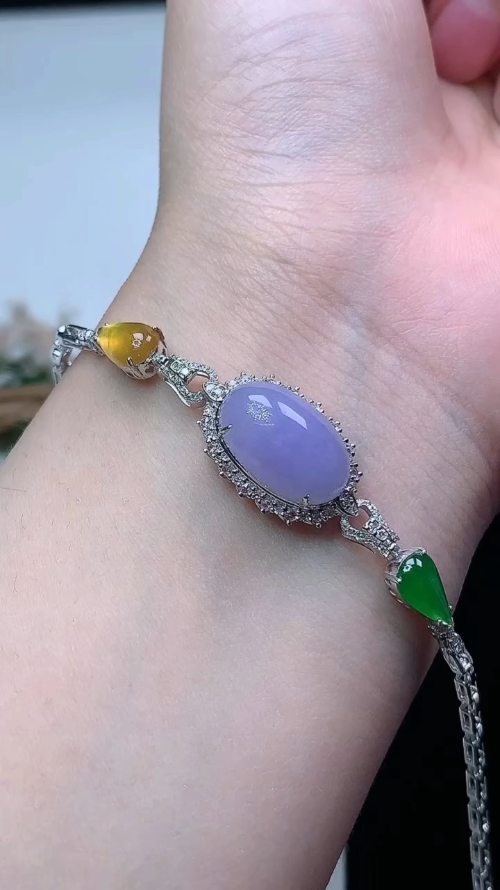 天然A货翡翠k金紫罗兰蛋面手链,尺寸14.6-9.3,重量:6.25g 4月16日