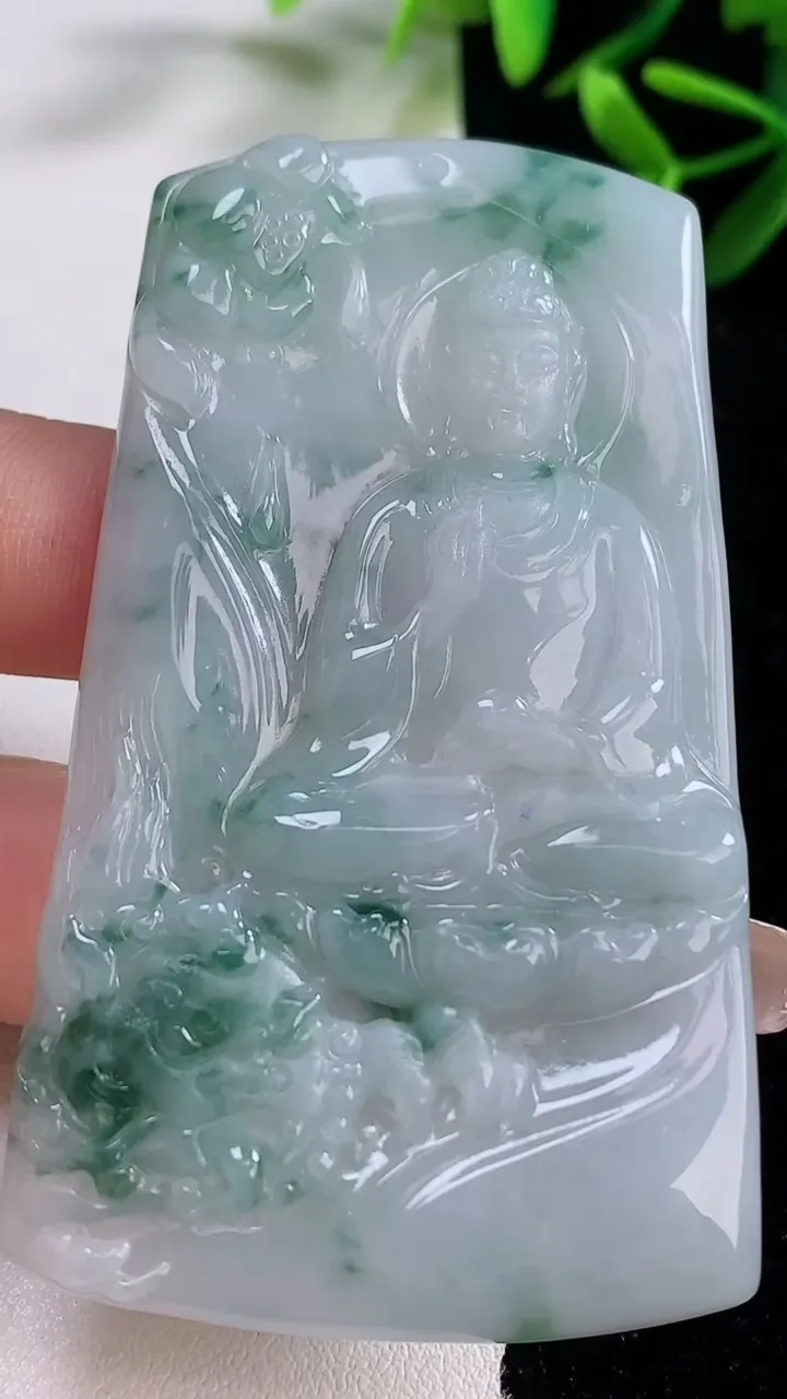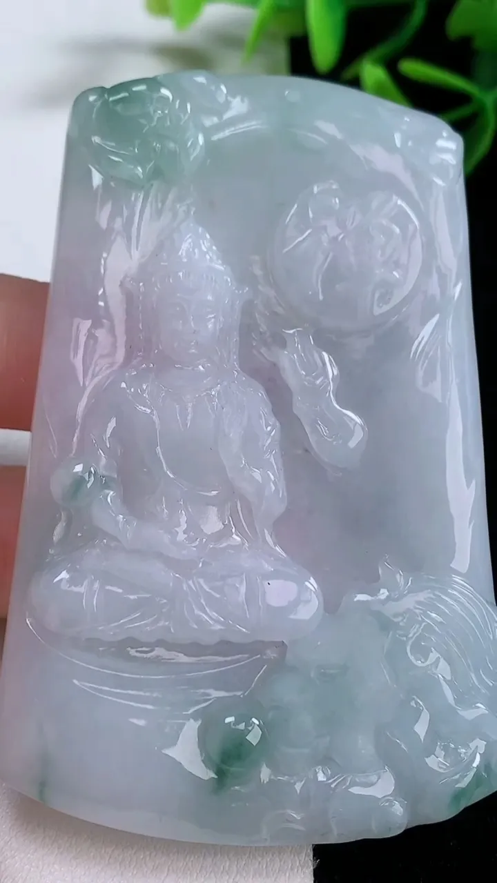 天然A货翡翠飘花文殊菩萨吊坠,尺寸77.3-48.7-5.8,重量:52.19g 12月26日