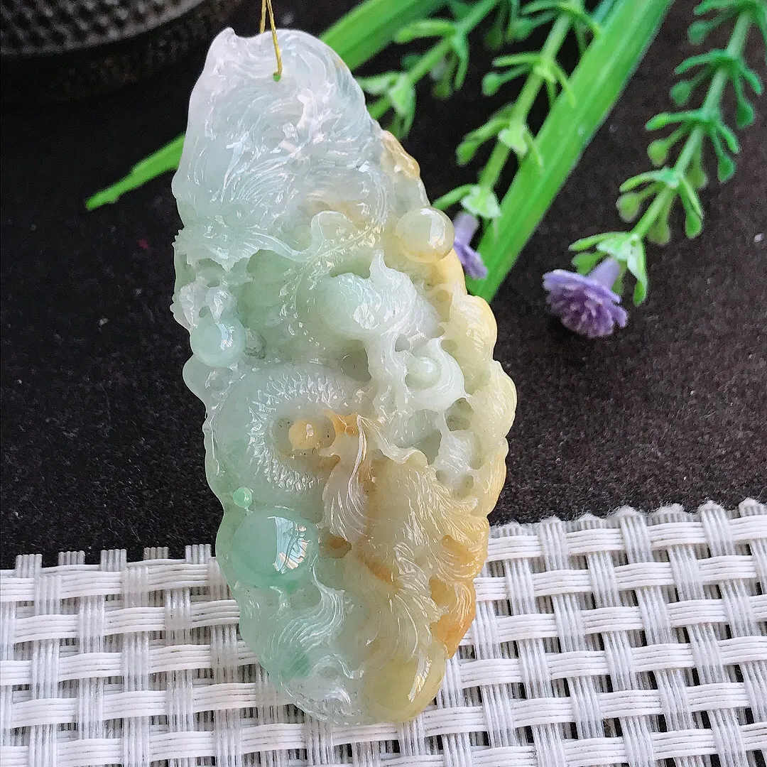 实拍A货翡翠64.5/29.6/10老坑精美三彩龙凤呈祥吊坠翡翠龙凤牌挂件