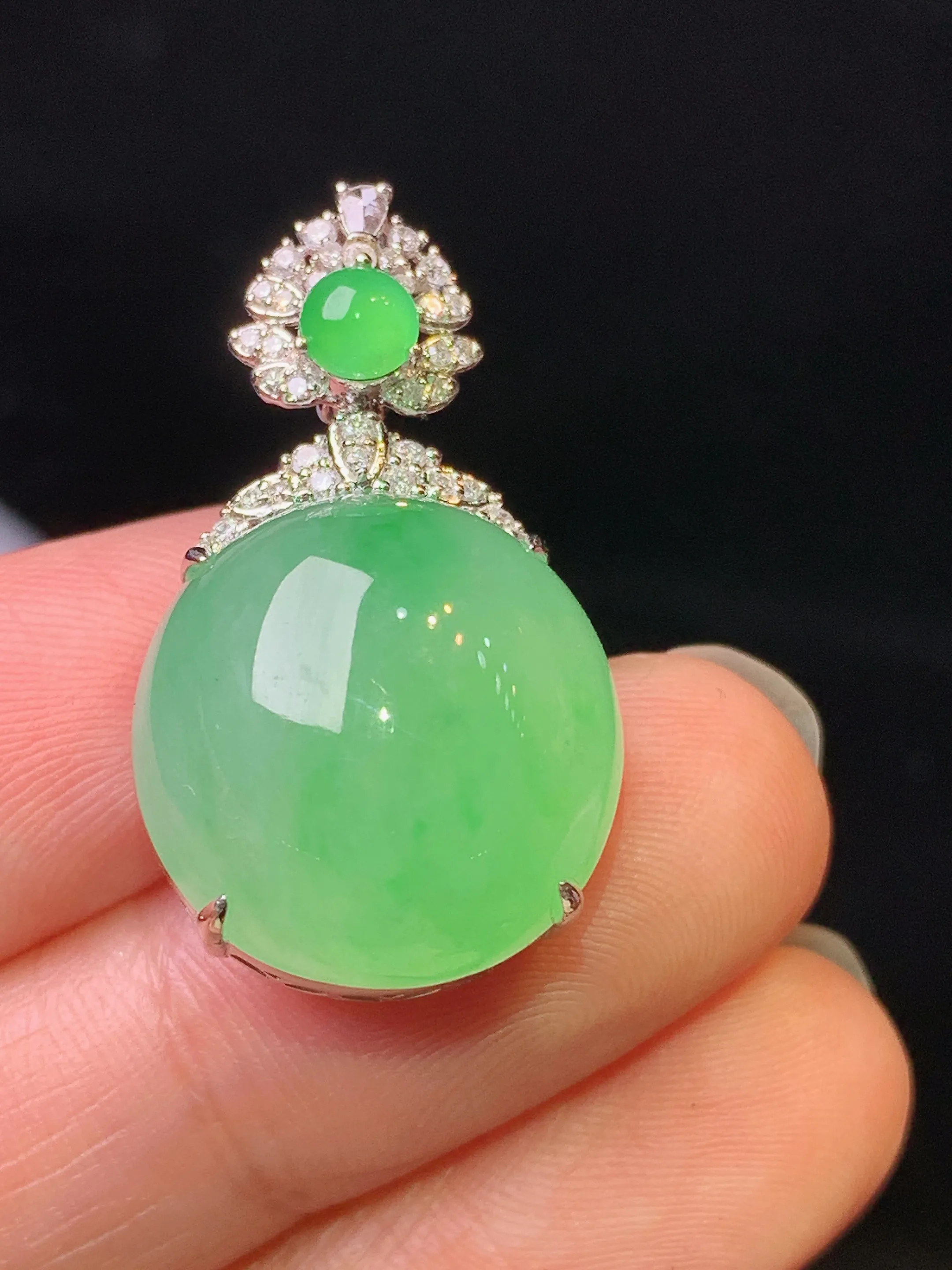 18k金钻镶嵌翠绿蛋面吊坠 玉质细腻 色泽艳丽清新 整体尺寸29.8*15.7*9.8