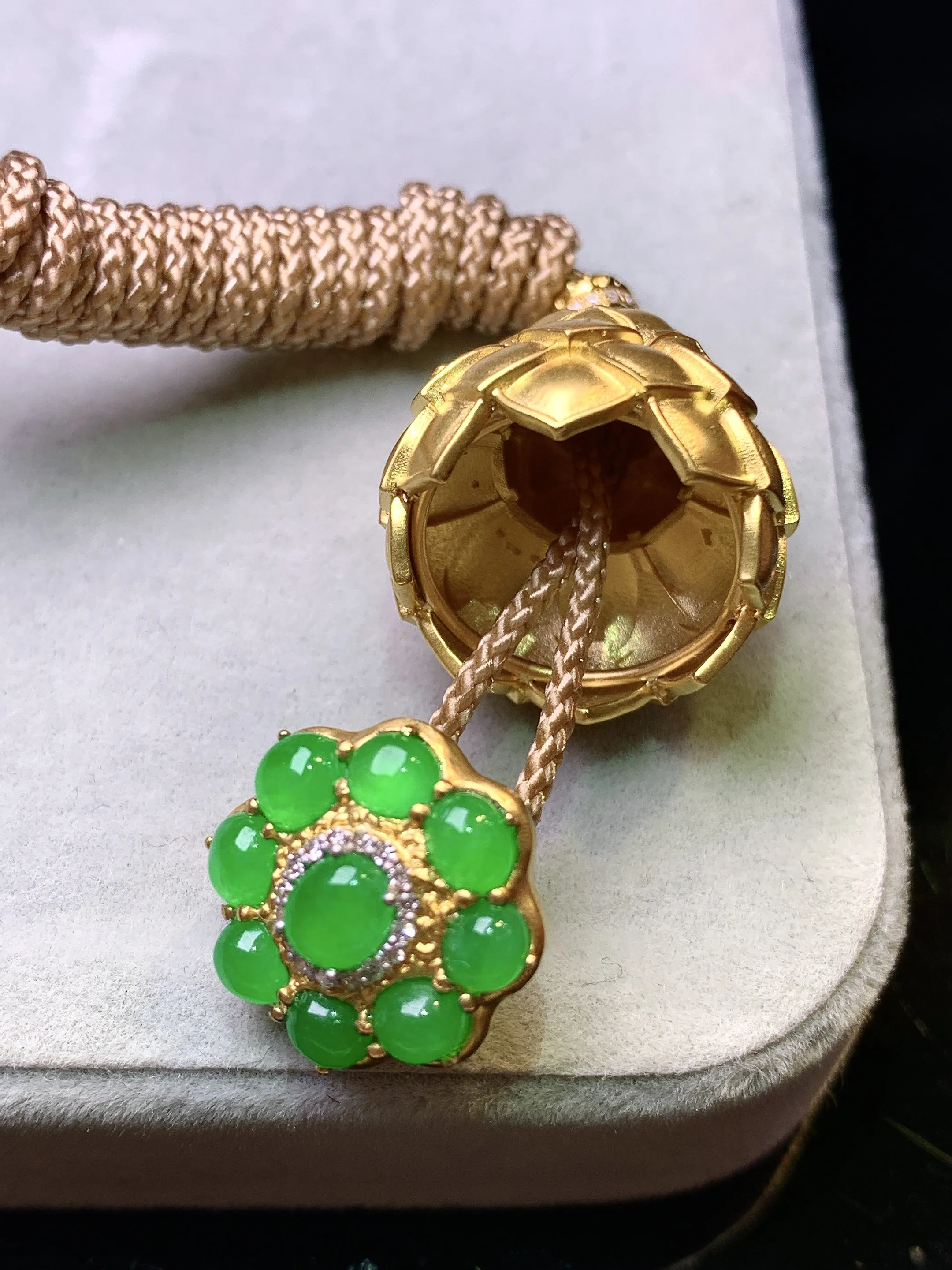 18k金钻镶嵌满绿蛋面组合花蕾吊坠 玉质细腻 色泽艳丽清新 整体尺寸27*17.5*17.5
