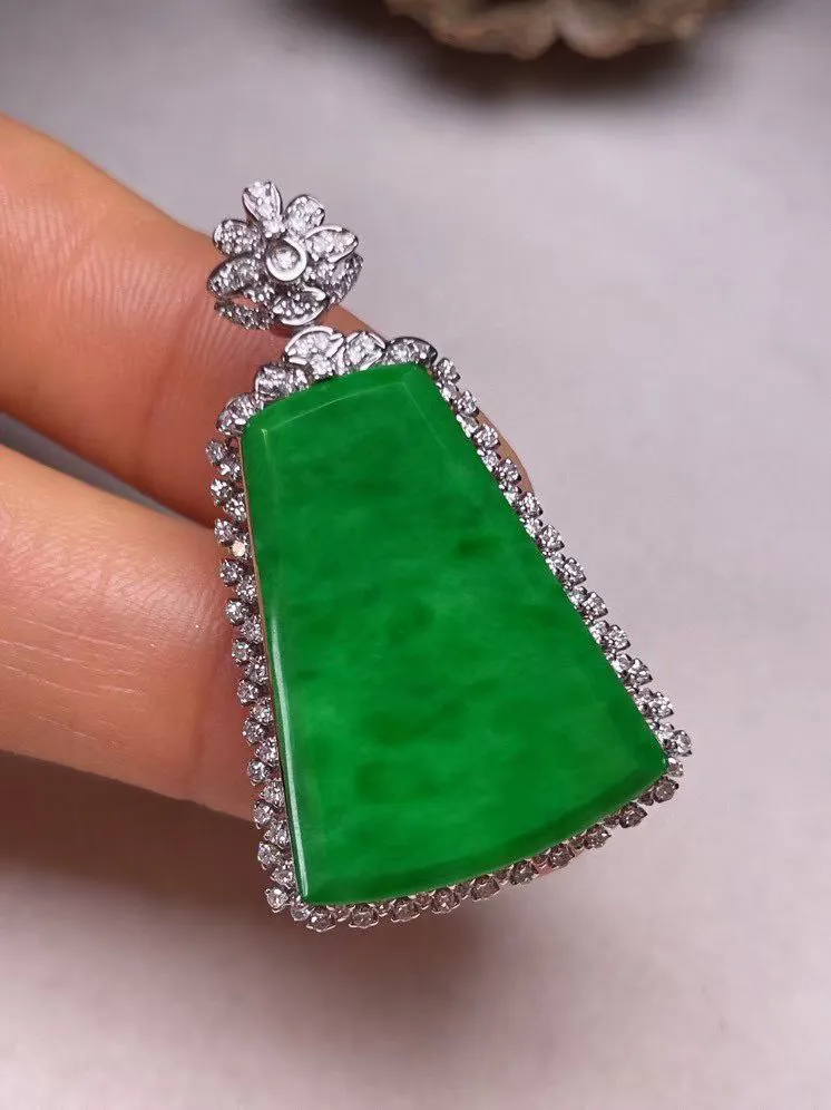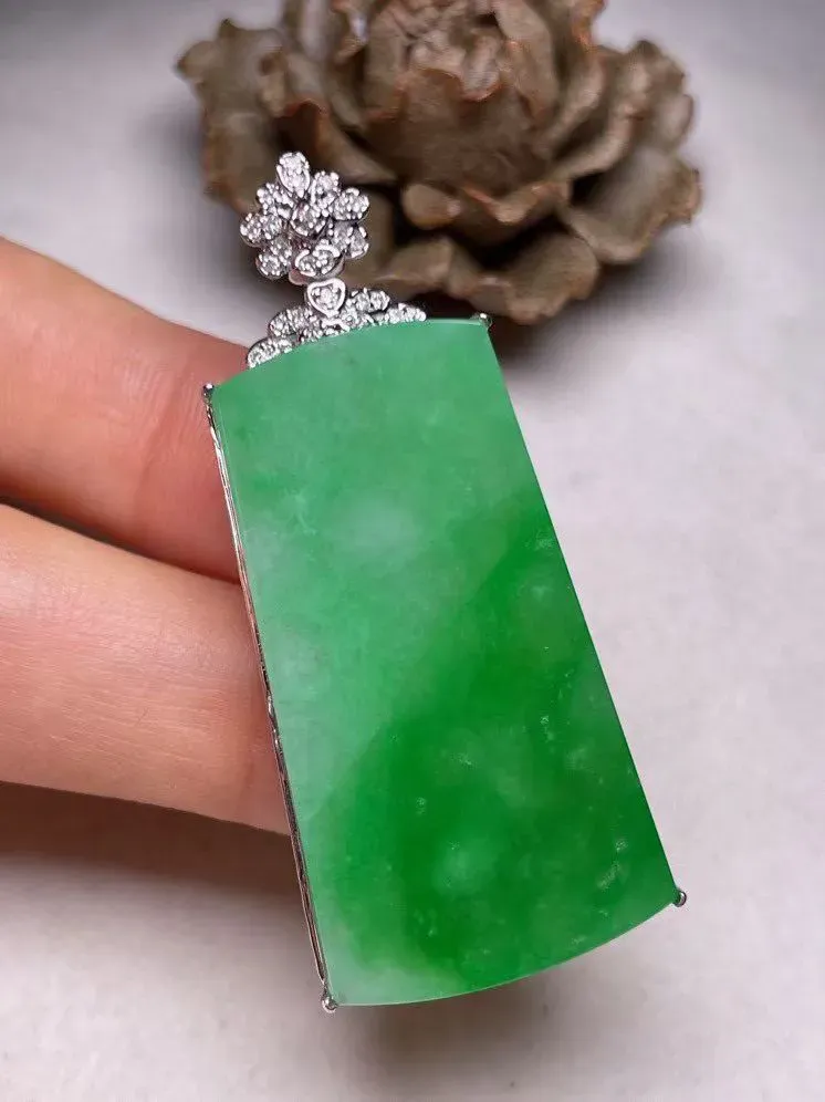 冰种阳绿平安无事牌吊坠、真金真钻镶嵌,种水好,玉质细腻 .裸石尺寸 38.5*20.6