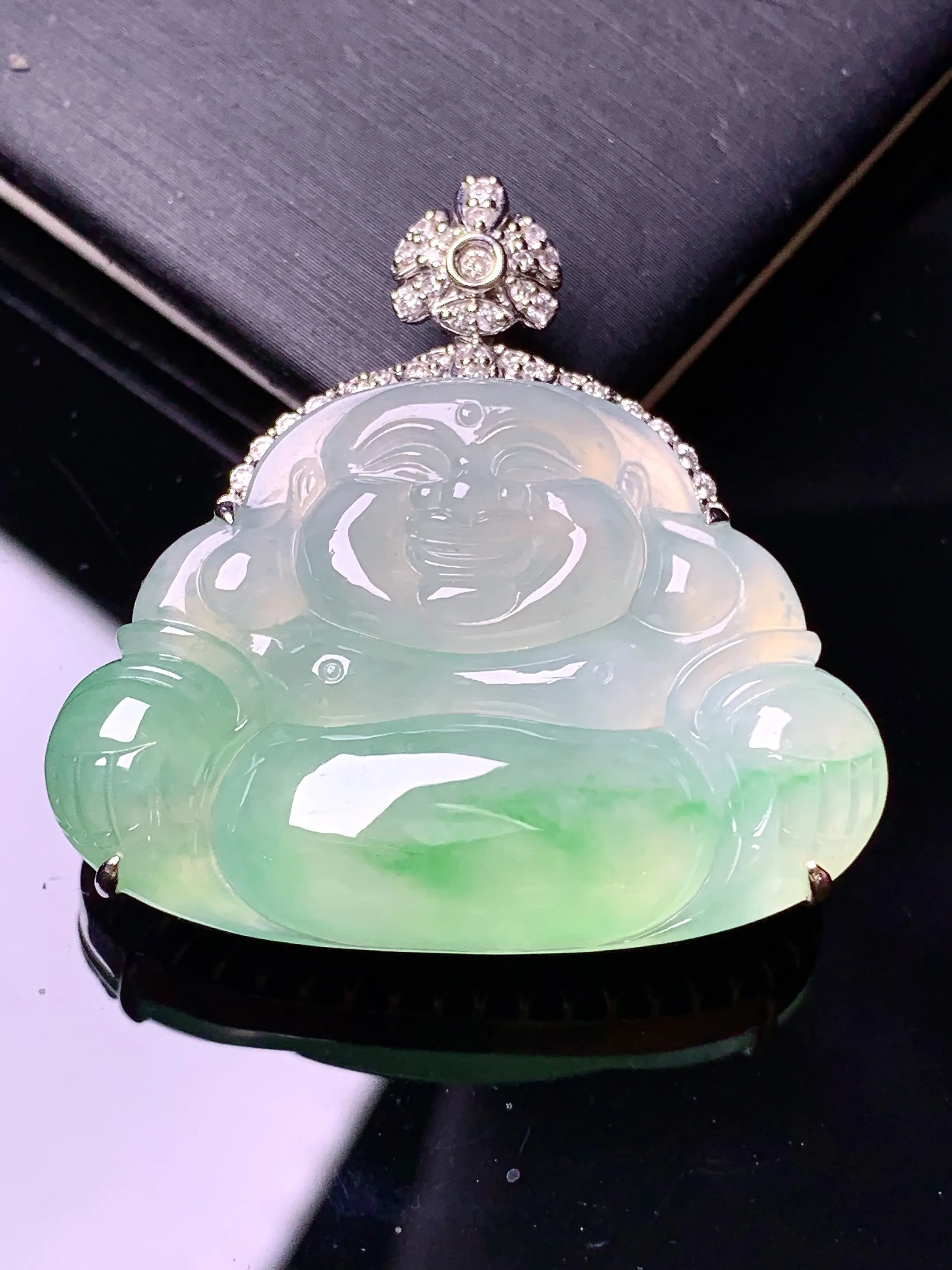 18金钻镶嵌飘绿佛公吊坠 玉质细腻 色泽清新艳丽 整体尺寸36*35.7*12.3