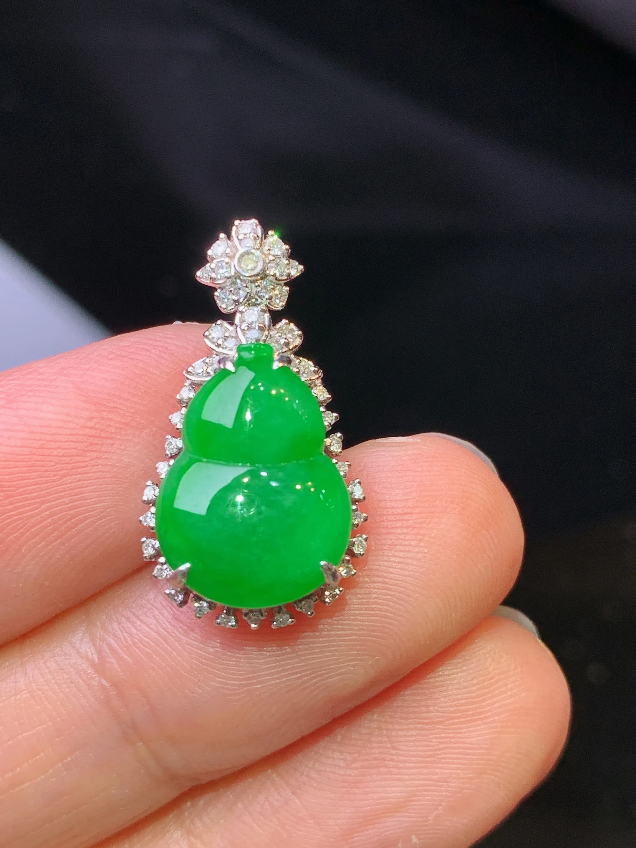 18金钻镶嵌满绿葫芦吊坠 玉质细腻 色泽清新艳丽 整体尺寸22.5*12*7