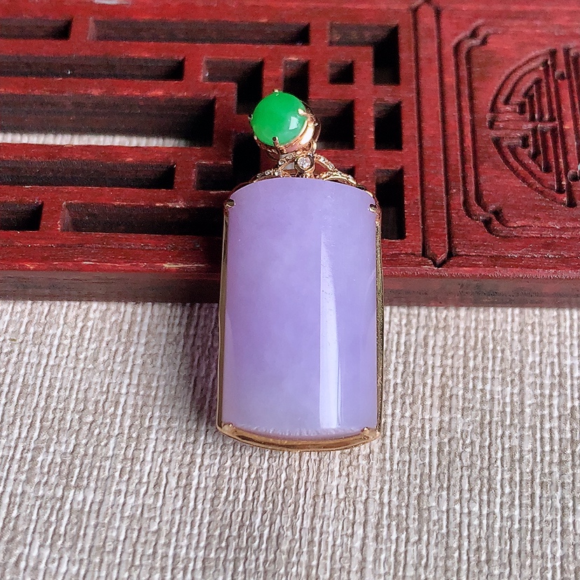 天然A货翡翠18K金伴钻镶嵌紫罗兰无事牌吊坠 尺寸32-13.8-8裸石21-12.3mm 重量4