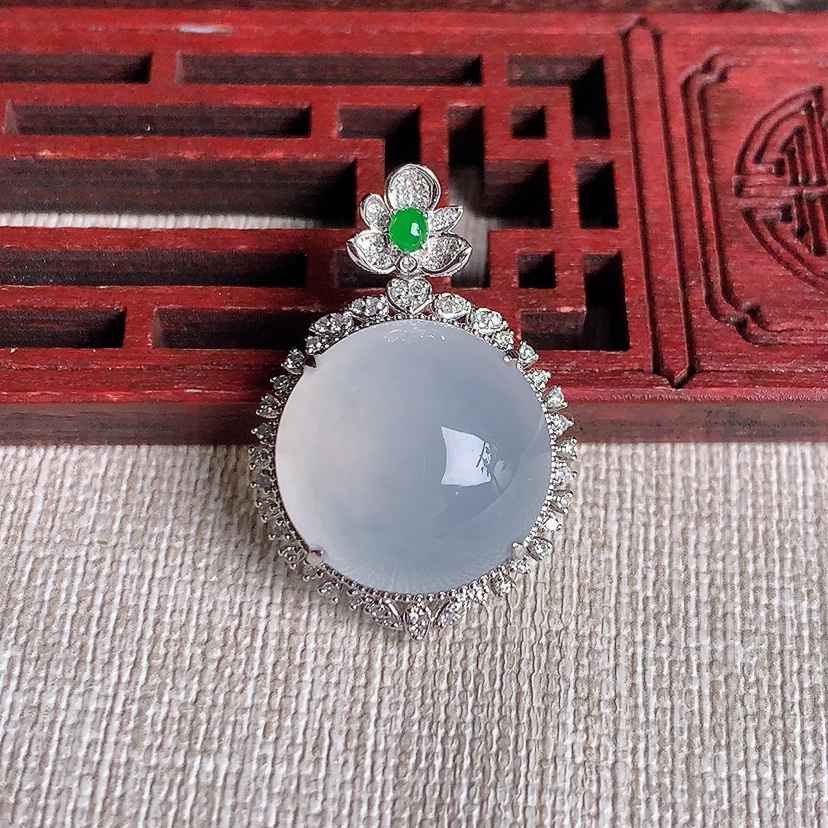 天然A货翡翠18K金伴钻镶嵌白冰白月光蛋面吊坠 尺寸29-20-11裸石16mm 重量5.80g