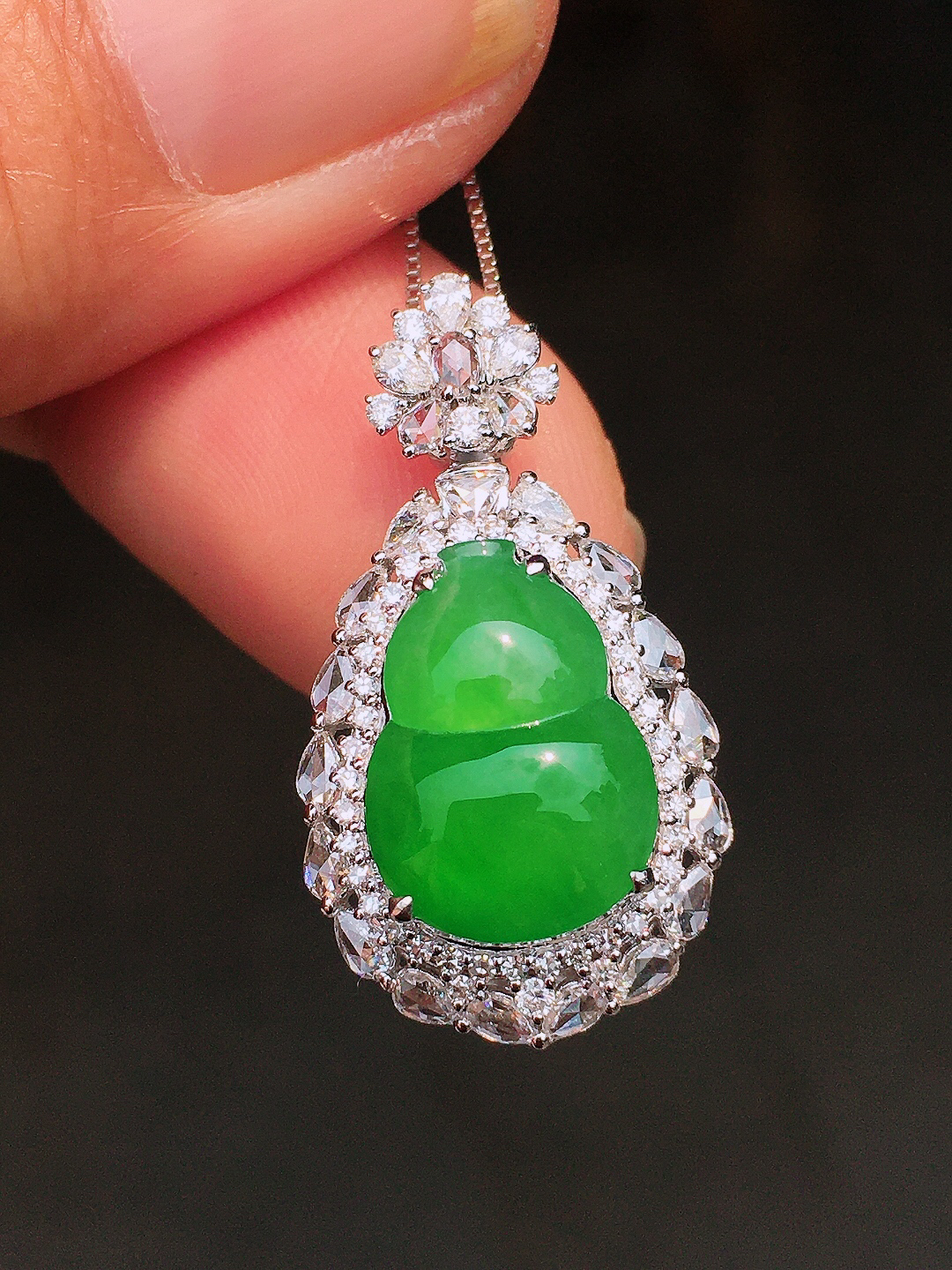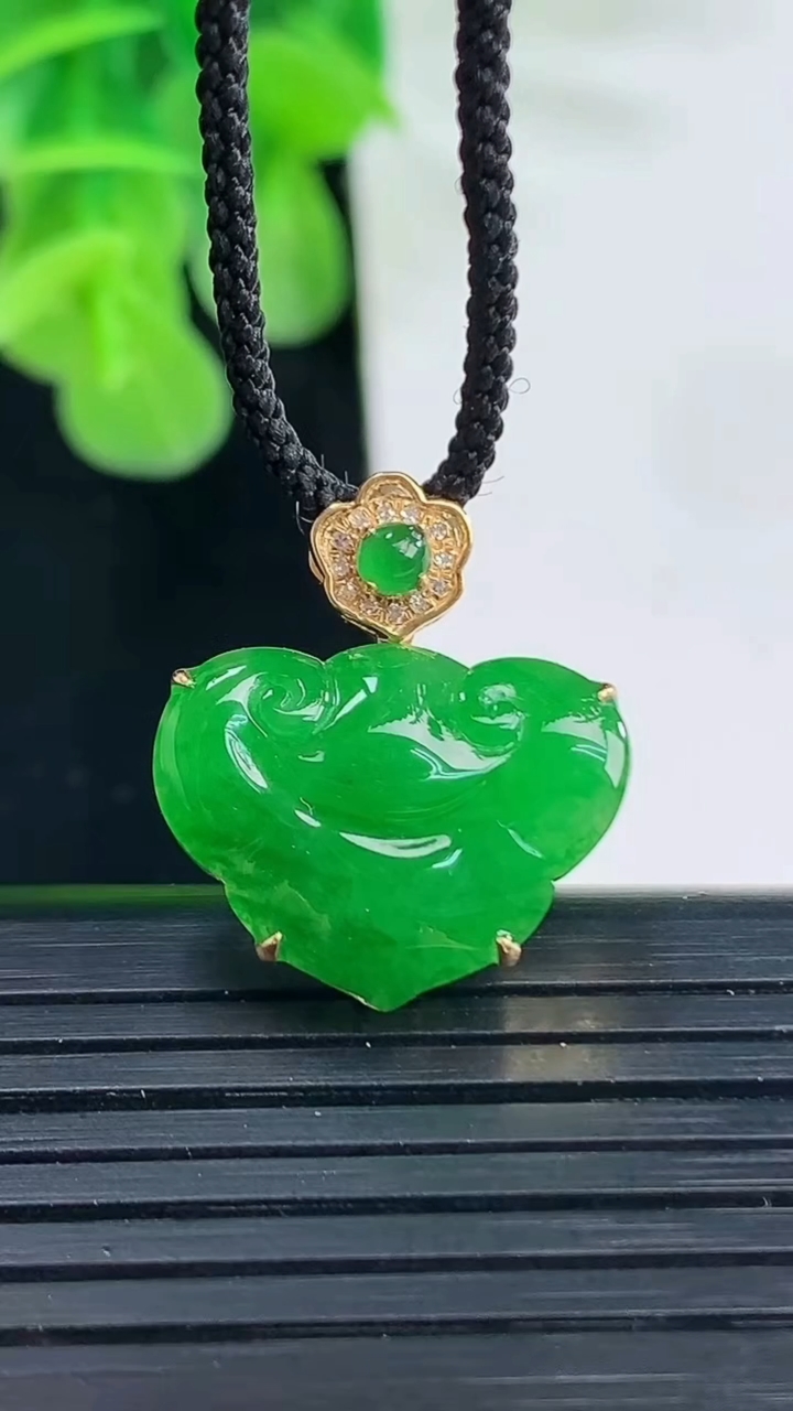 阳绿葫芦吊坠,色泽均匀艳丽,玉质细腻,荧光感超 强,饱满圆润,尽显优雅气质,18k 金豪华镶嵌