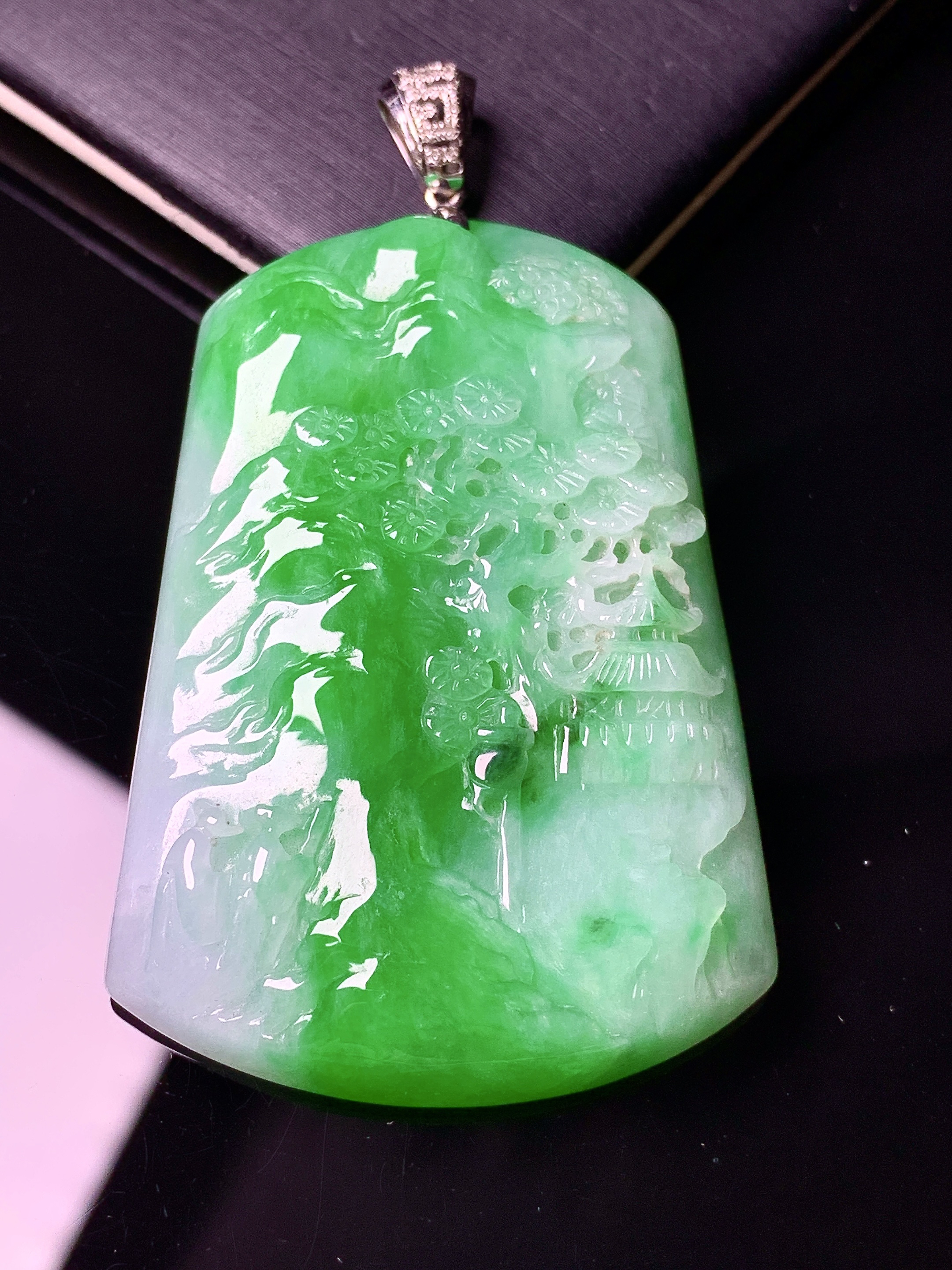 18k金镶嵌翠绿山水牌子吊坠 玉质细腻 色泽艳丽清新 水润亮眼 整体尺寸61.5*35.3*6.6L