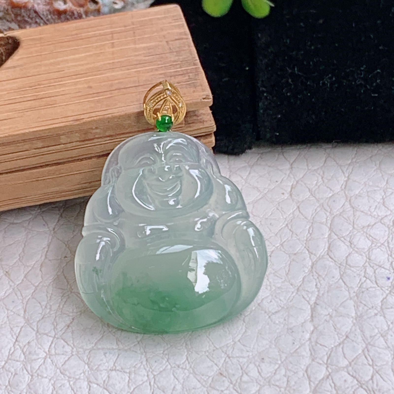 zz3实拍25*23.8*5天然缅甸翡翠冰种佛公吊坠 镶金扣精雕弥勒佛一刀切