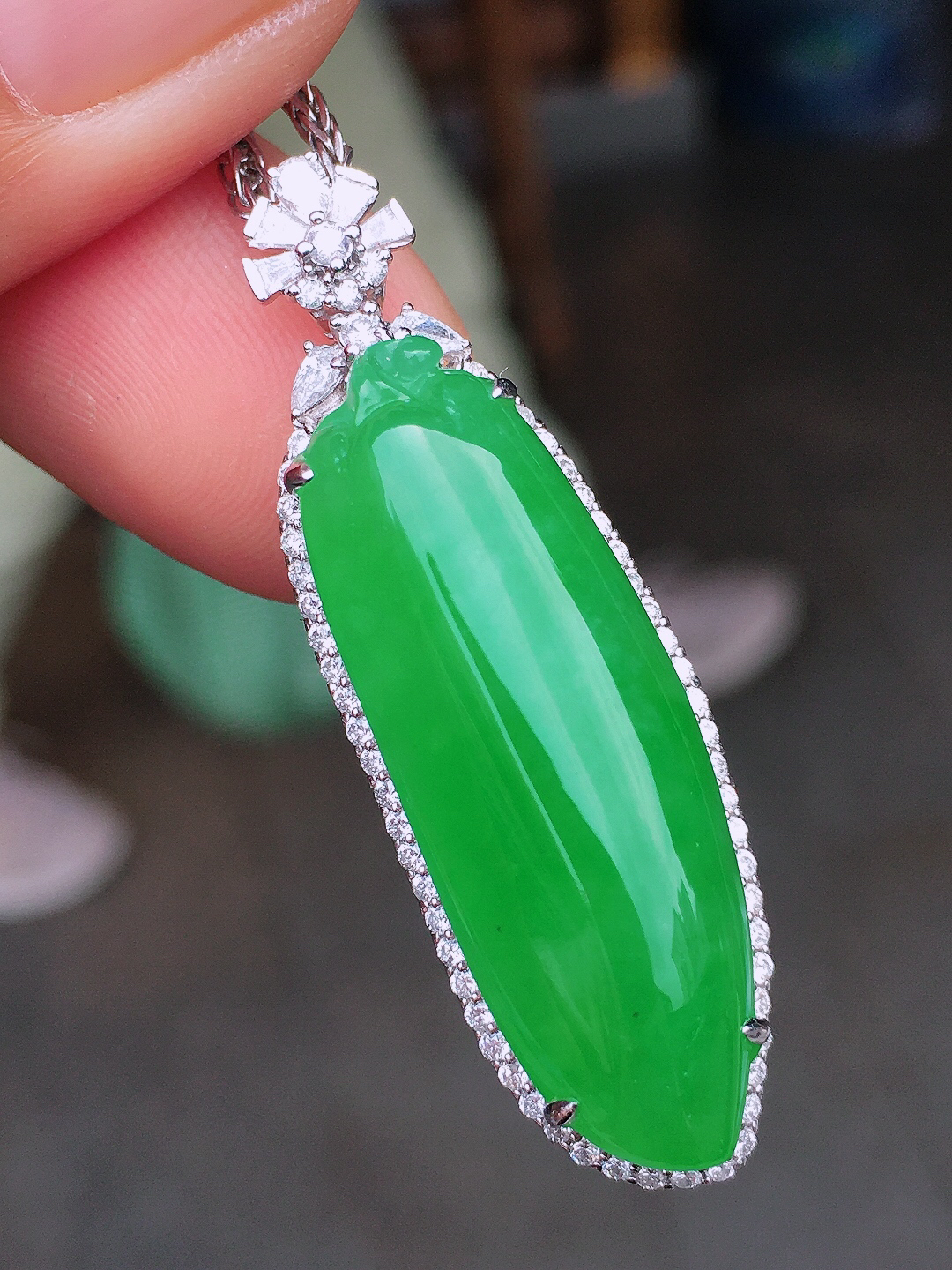 zz3实拍连金25.8*14.5*5.3天然缅甸翡翠冰飘阳绿花胡芦吊坠 镶金福禄锁骨坠