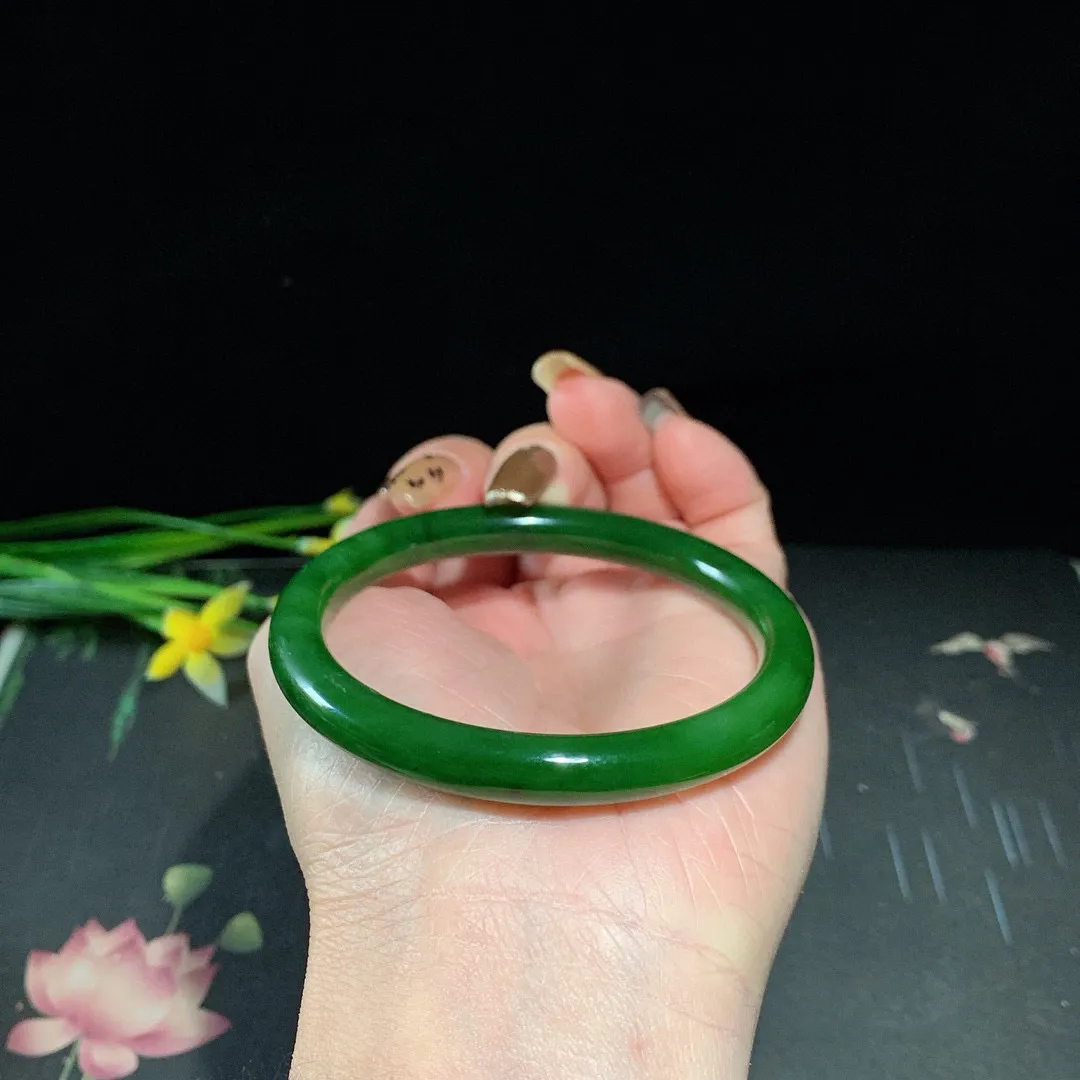 和田玉57.5圈口菠菜绿圆条碧玉手镯!玉质细腻油润 底色纯净 无纹裂 脂粉好,品质高