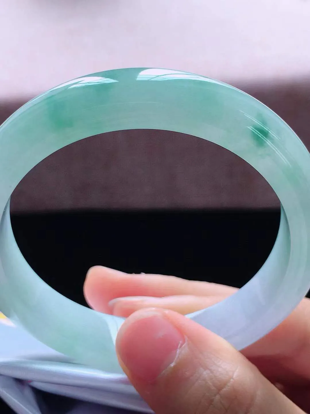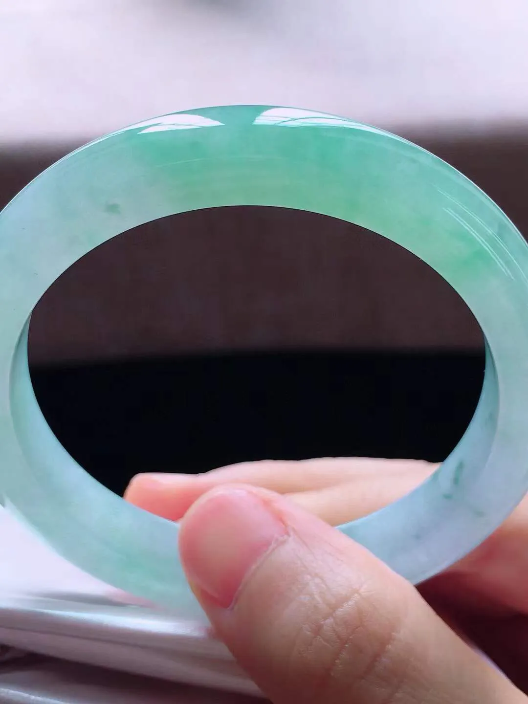 【翡翠名称】老种冰飘绿53正圈口翡翠手镯 【翡翠尺寸】53*10*7.6mm适合52-54正圈口佩戴
