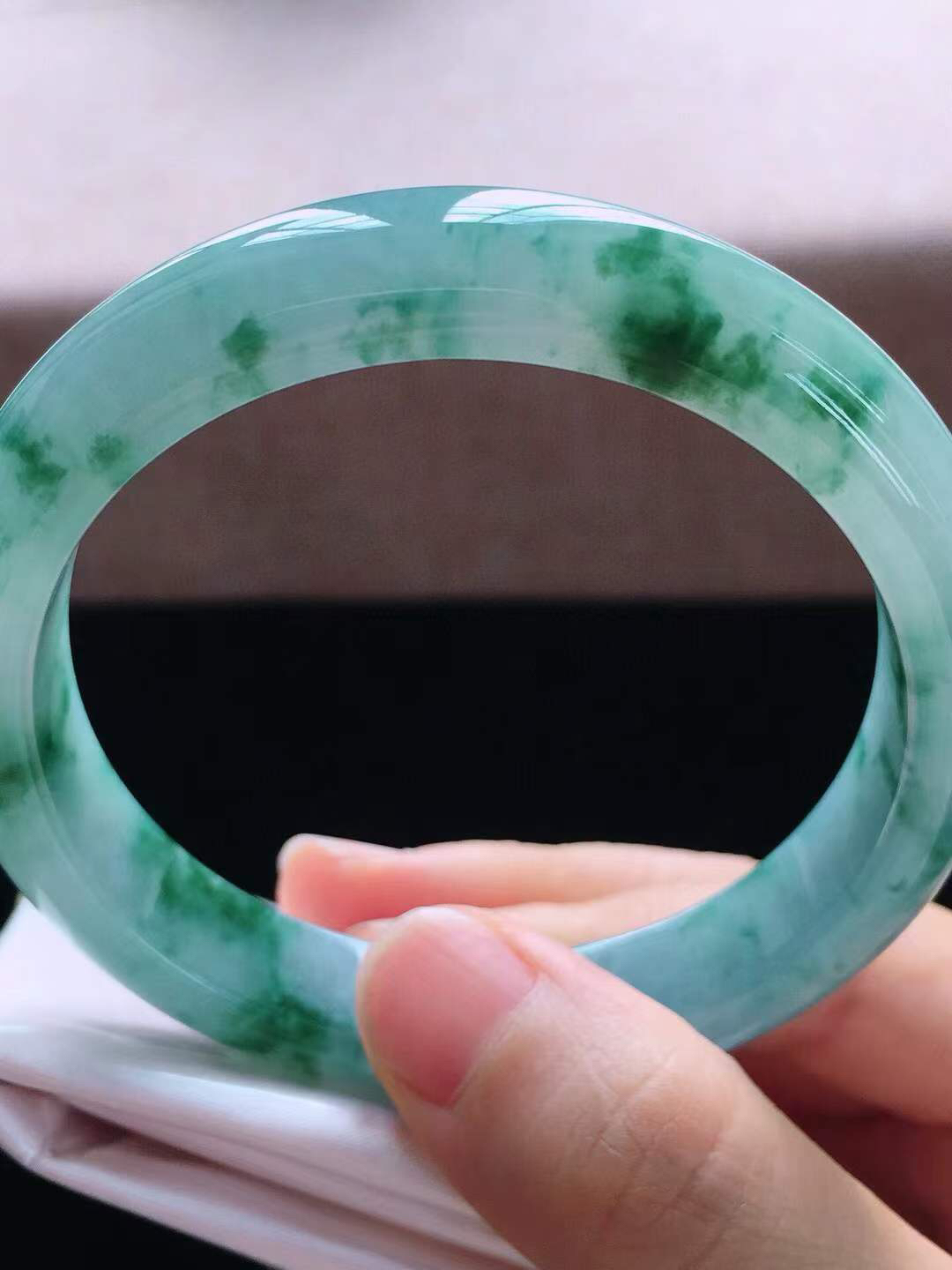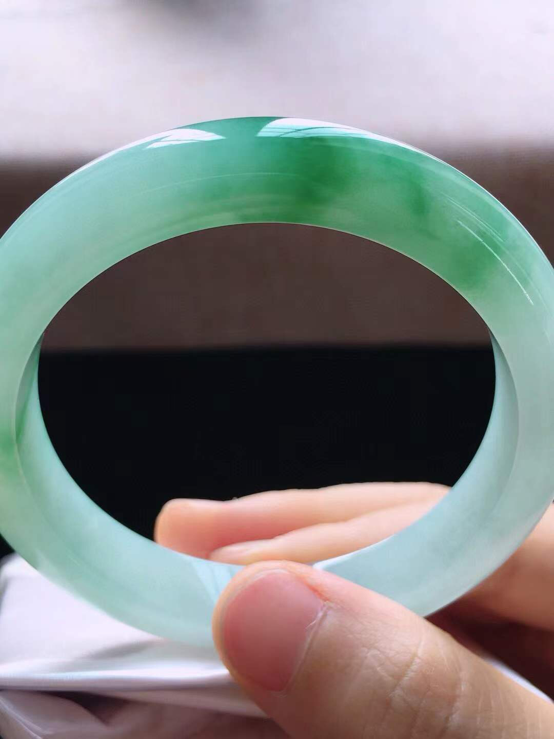 【翡翠名称】老种冰晴绿58.3正圈口手镯 【翡翠尺寸】58.3*10*8.8mm适合57.5-59.