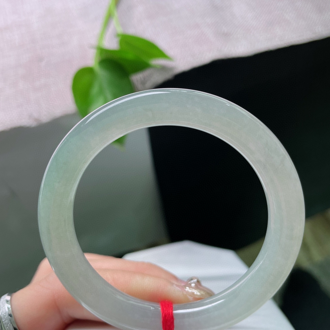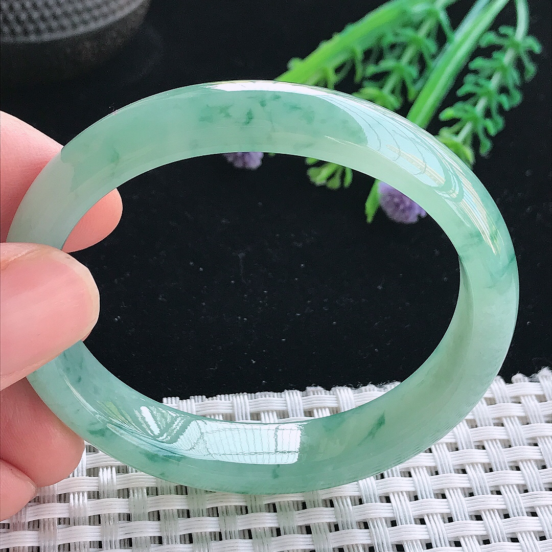 飘花圆条手镯尺寸50*9*8.8 底子洁白通透,质地细腻,胶润水足,几抹花色灵动,整体清新素雅!