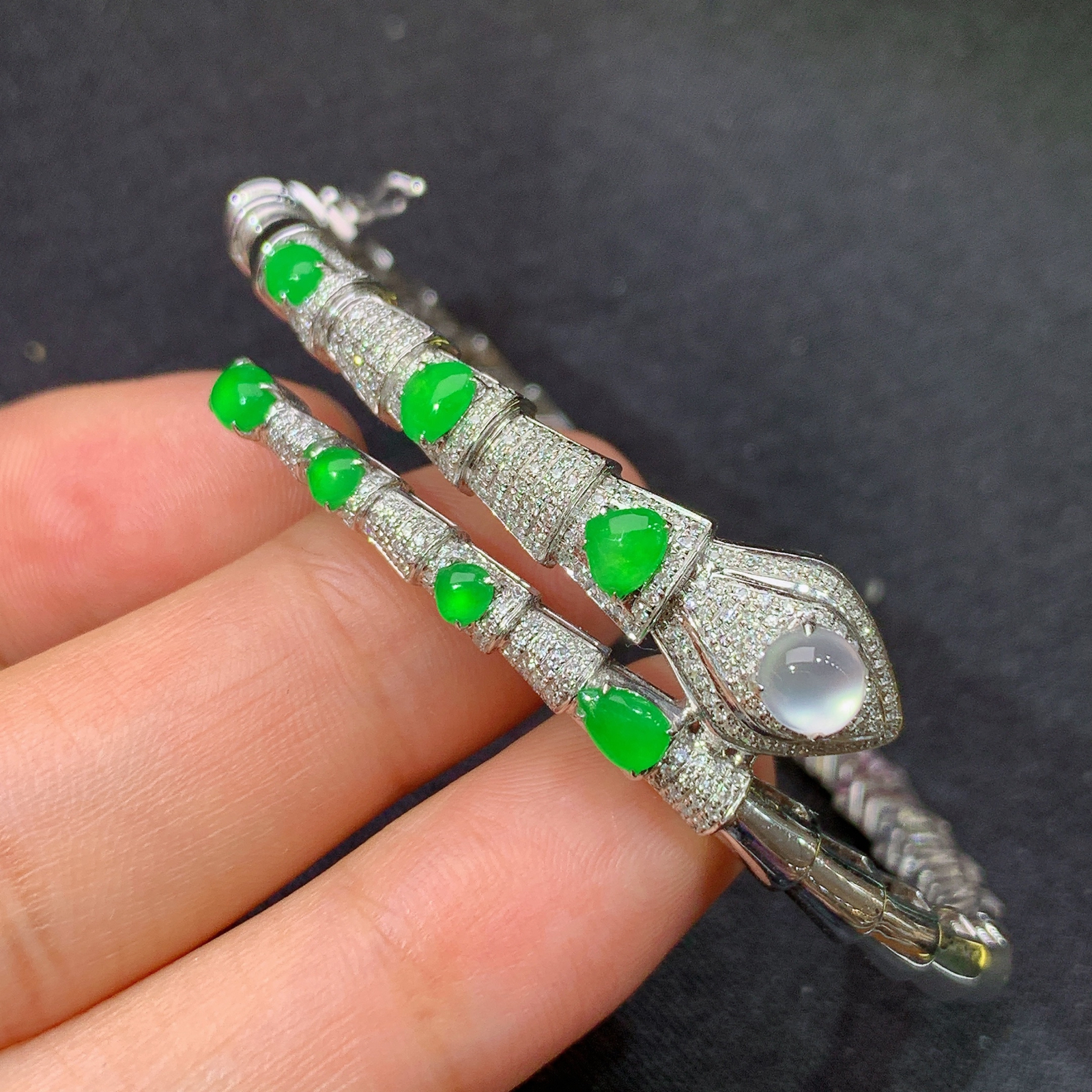 冰阳绿水滴手镯,18k金镶嵌,款式新颖,冰润色阳,种水足,Mi 圈口55.1 裸石4.6*4.3*2