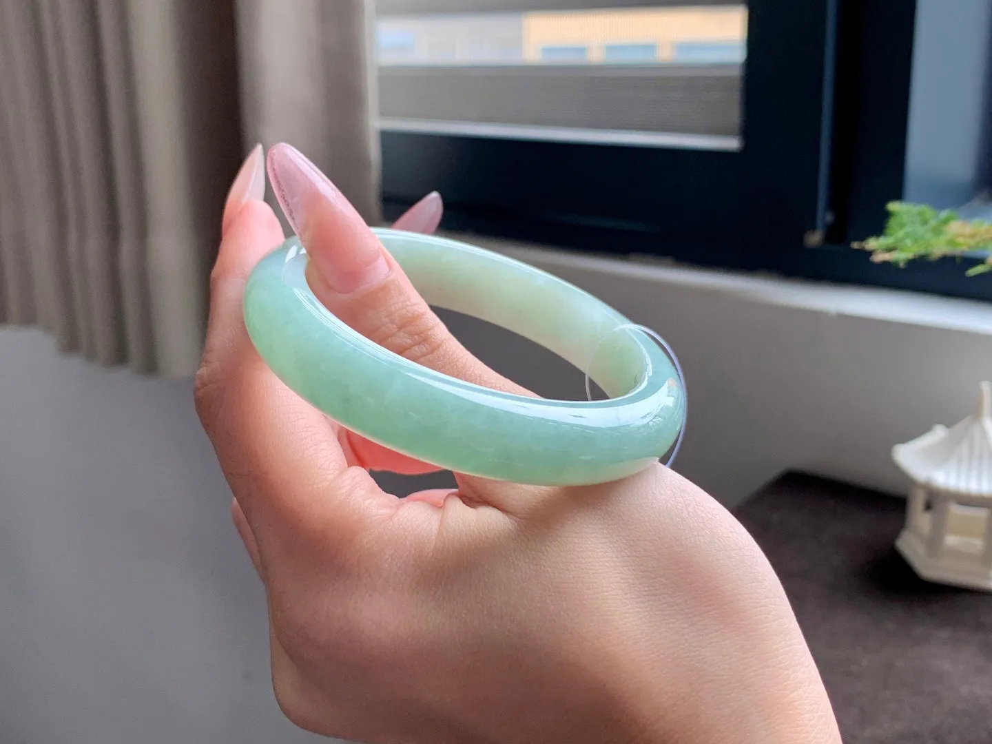 【翡翠名称】老种冰飘绿57.3圈口圆条翡翠手镯 【翡翠尺寸】57.3*11.2*11.2mm适合57