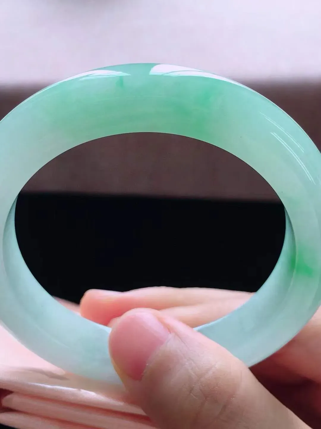 【翡翠名称】老种飘绿花54.8正圈口翡翠手镯 【翡翠尺寸】54.8*11.3*9.5mm适合53.8