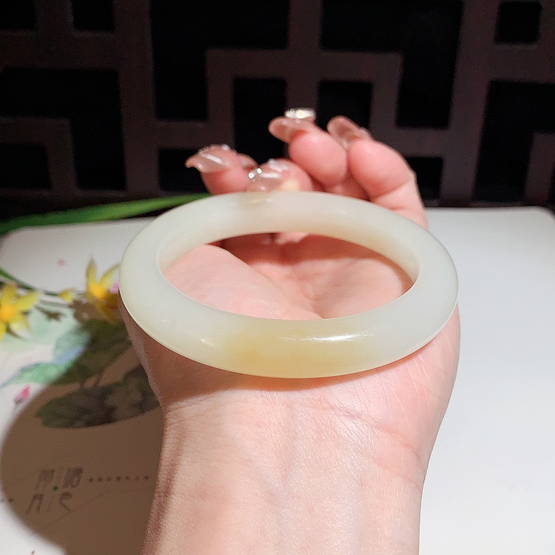 和田玉57.5圈口且末糖手镯!玉质细腻油润 底色纯净 无裂无黑 脂粉好,品质高。