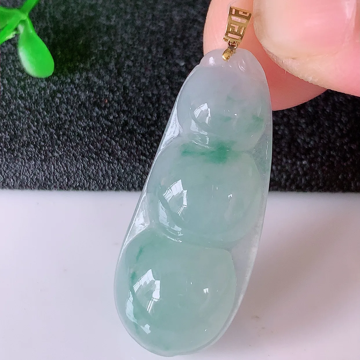 18K金镶嵌冰种飘花翡翠四季豆吊坠,平安豆福豆玉坠,冰润通透,豆粒饱满,寓意:豆蔻年华!#49.11