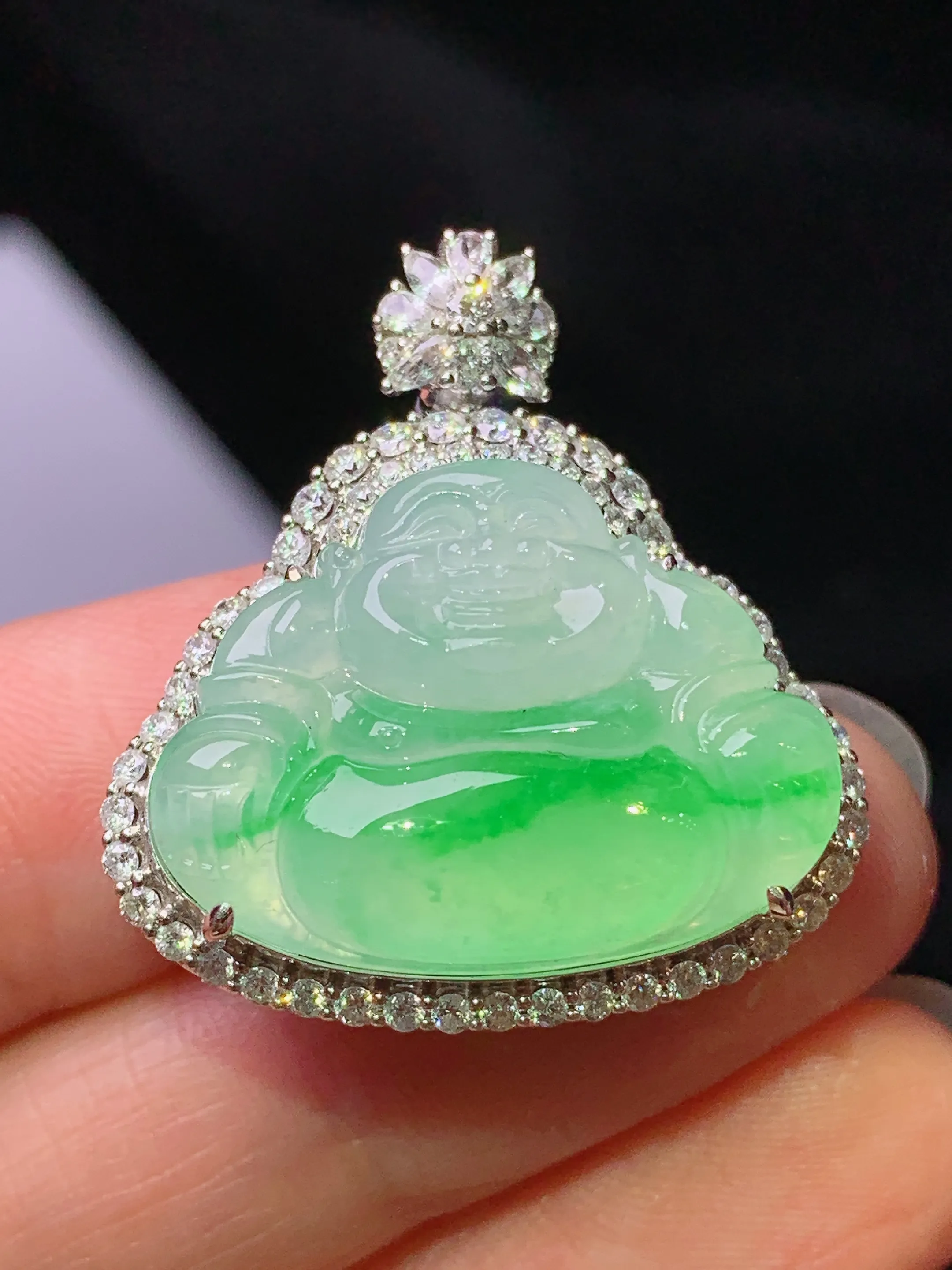 18k金钻镶嵌飘绿佛公吊坠 玉质细腻 色泽艳丽清新 整体尺寸29.3*26.8*10.5