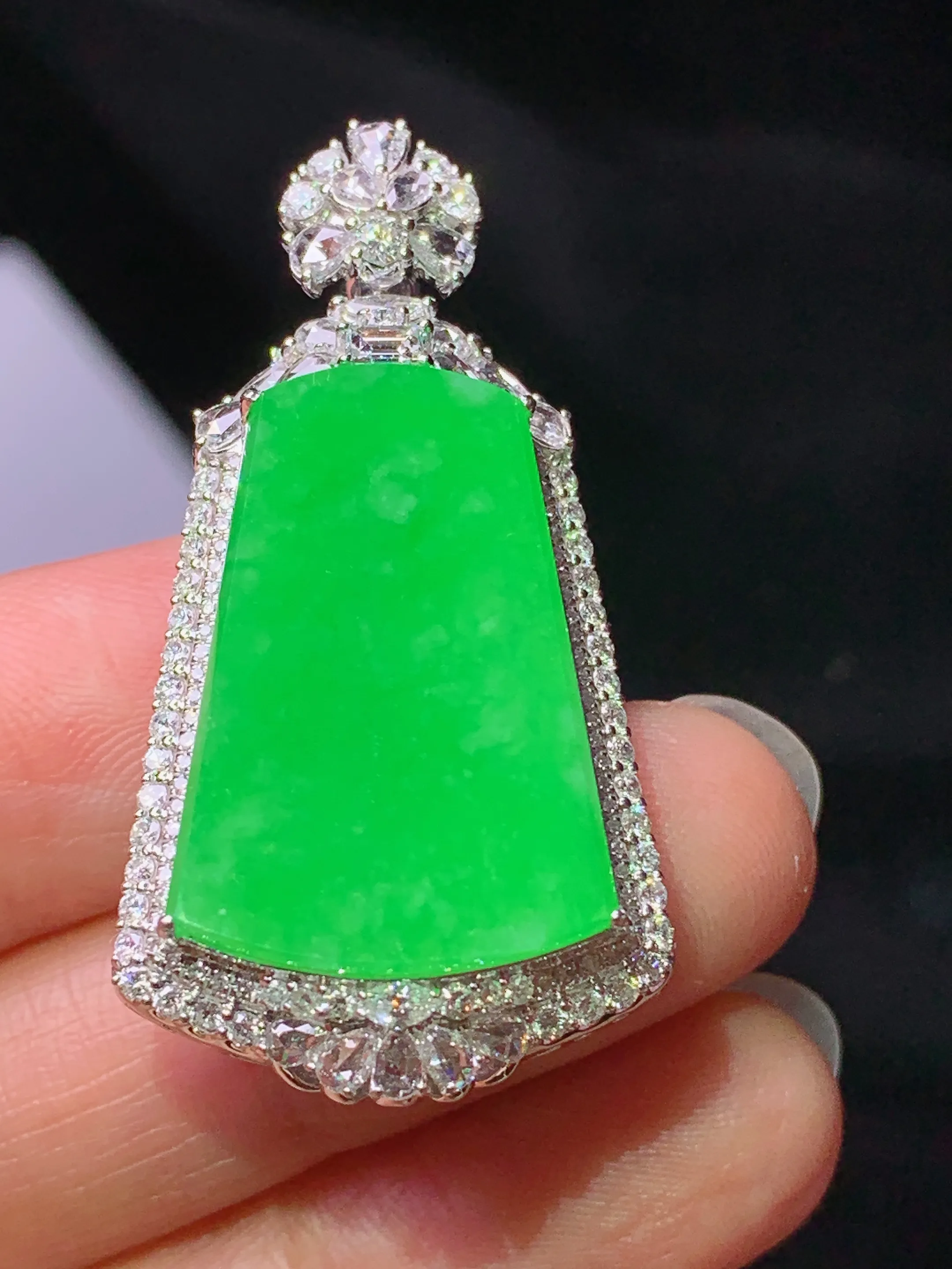 18k金钻镶嵌翠绿无事牌吊坠 玉质细腻 色泽艳丽清新 整体尺寸40.5*21.1*11.3