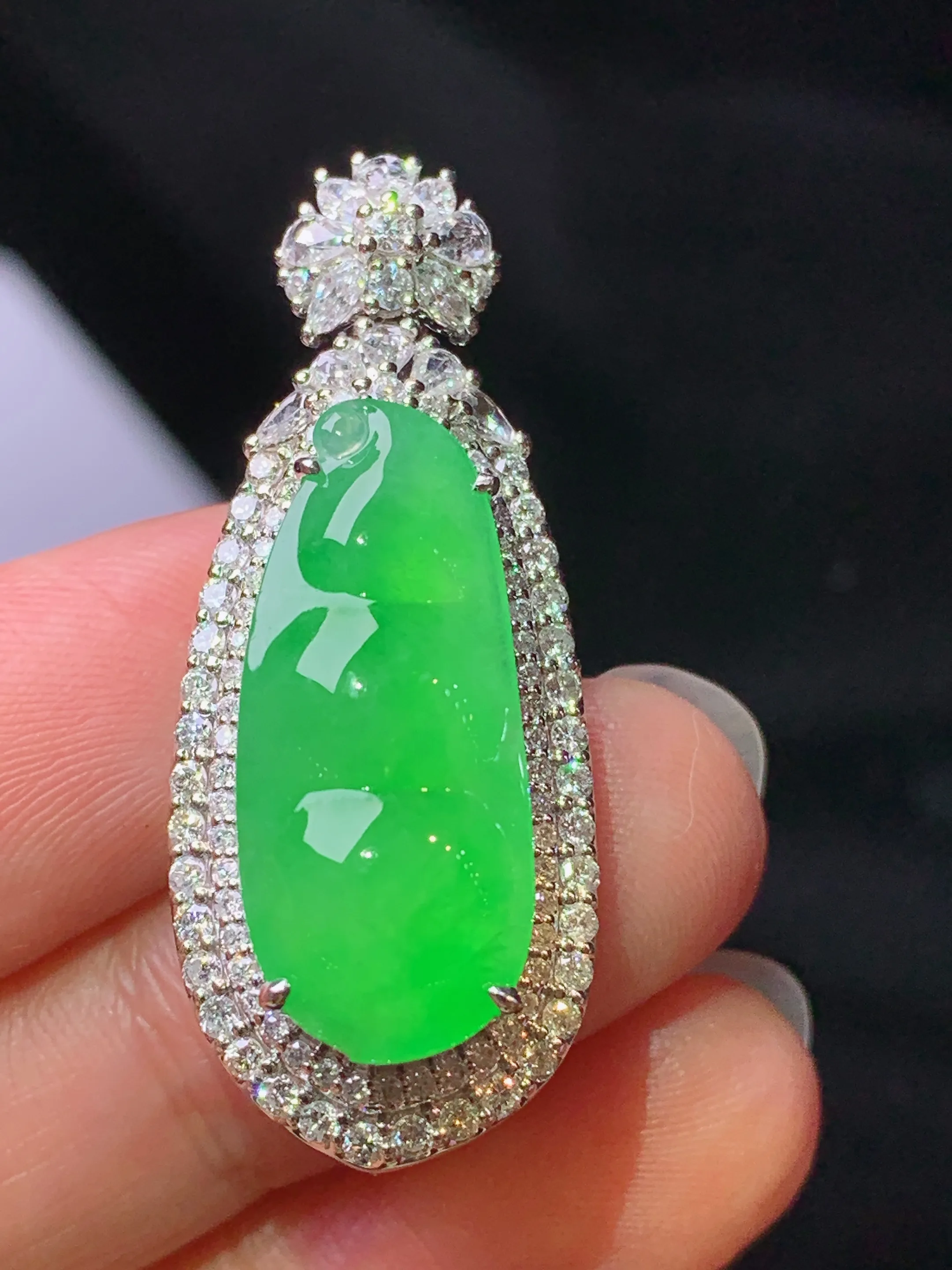 18k金钻镶嵌翠绿四季豆吊坠 玉质细腻 色泽艳丽清新 整体尺寸37*15.2*12.6