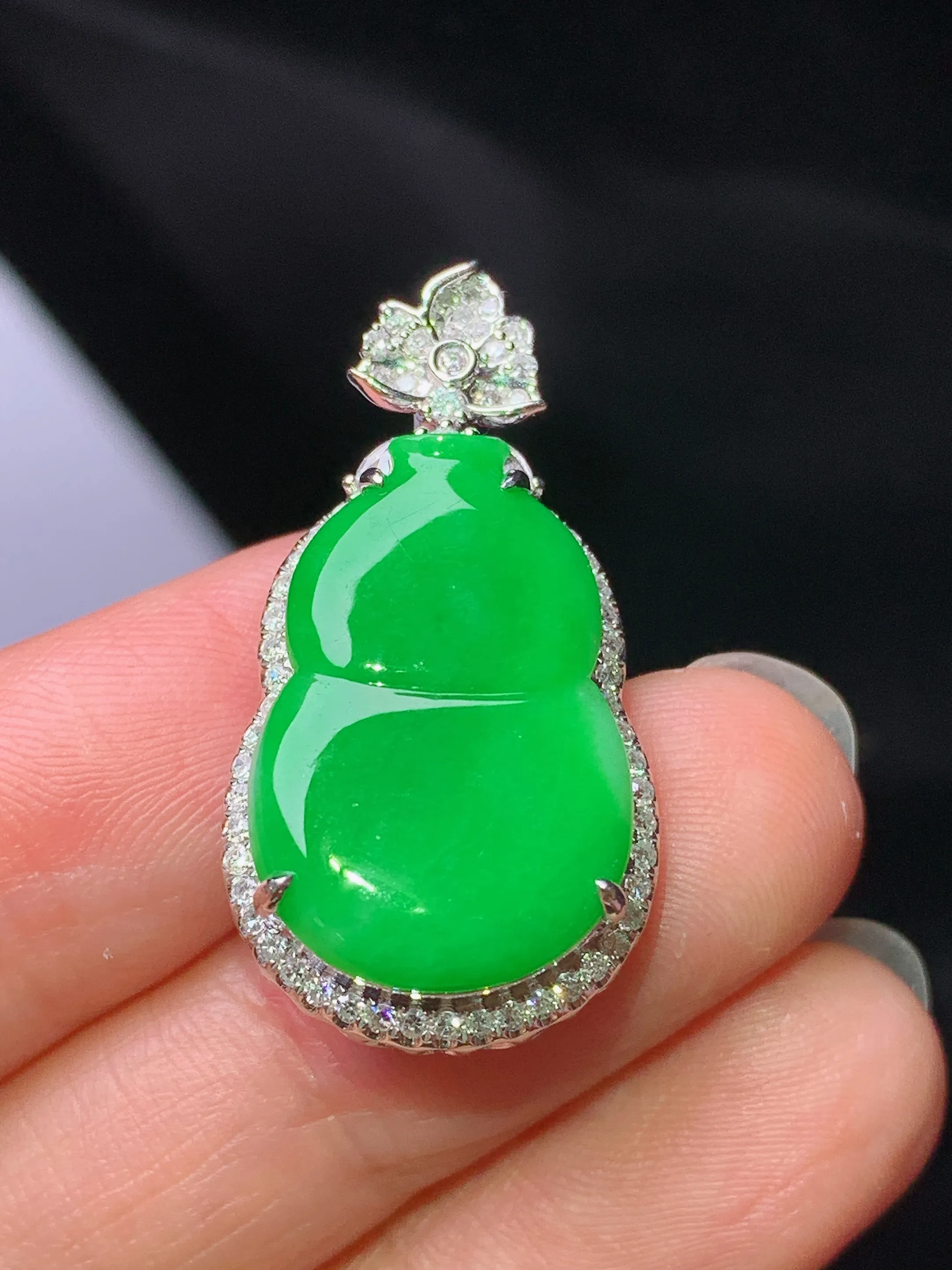 18k金钻镶嵌翠绿葫芦吊坠 玉质细腻 色泽艳丽清新 整体尺寸31*16.3*8.2