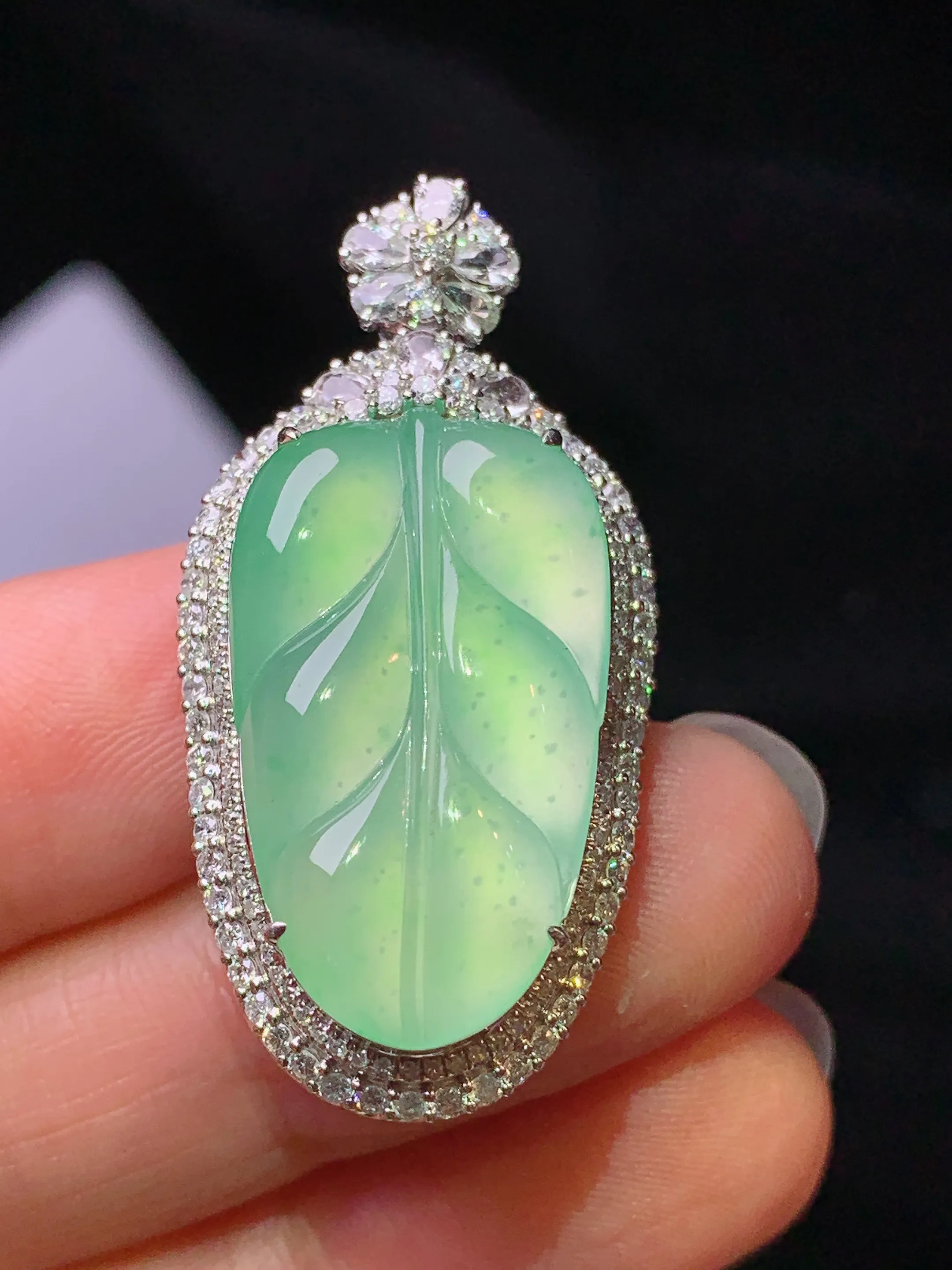 18k金钻镶嵌浅绿树叶吊坠 玉质细腻 色泽艳丽清新 整体尺寸38*19.2*10.8