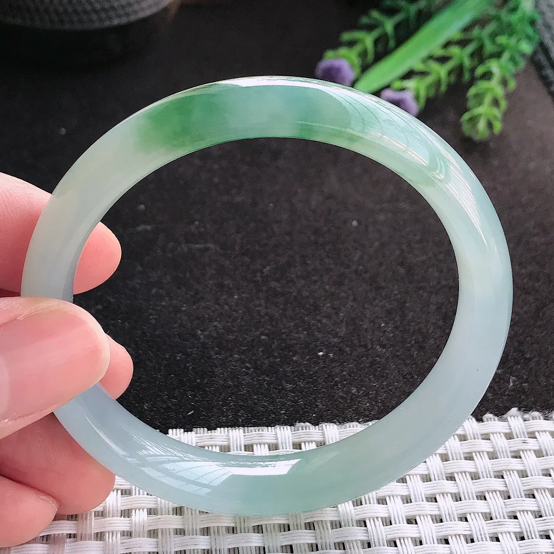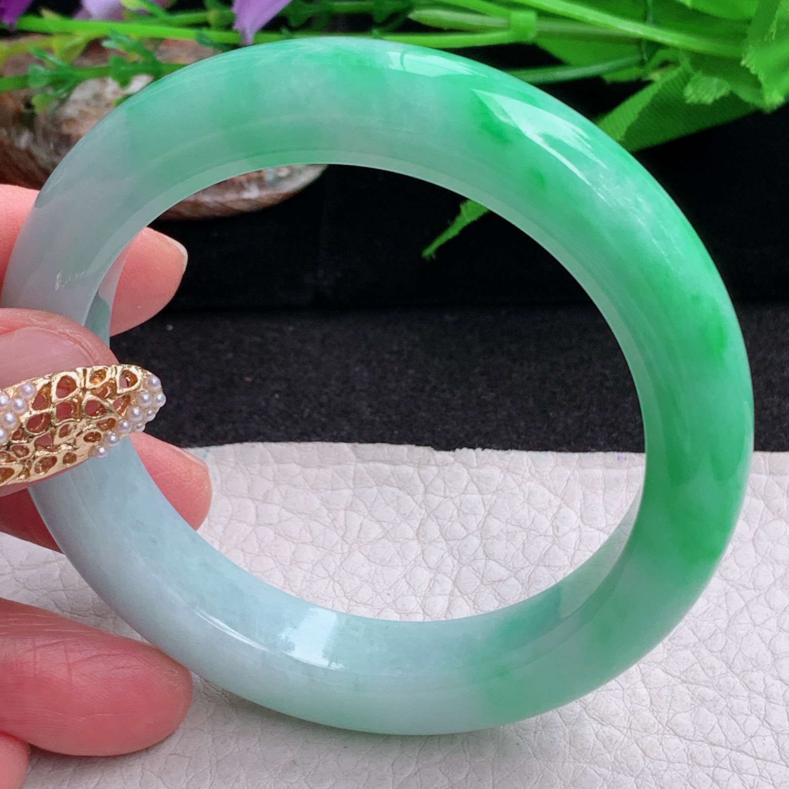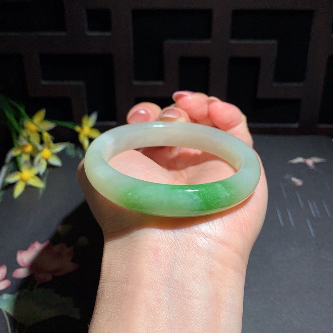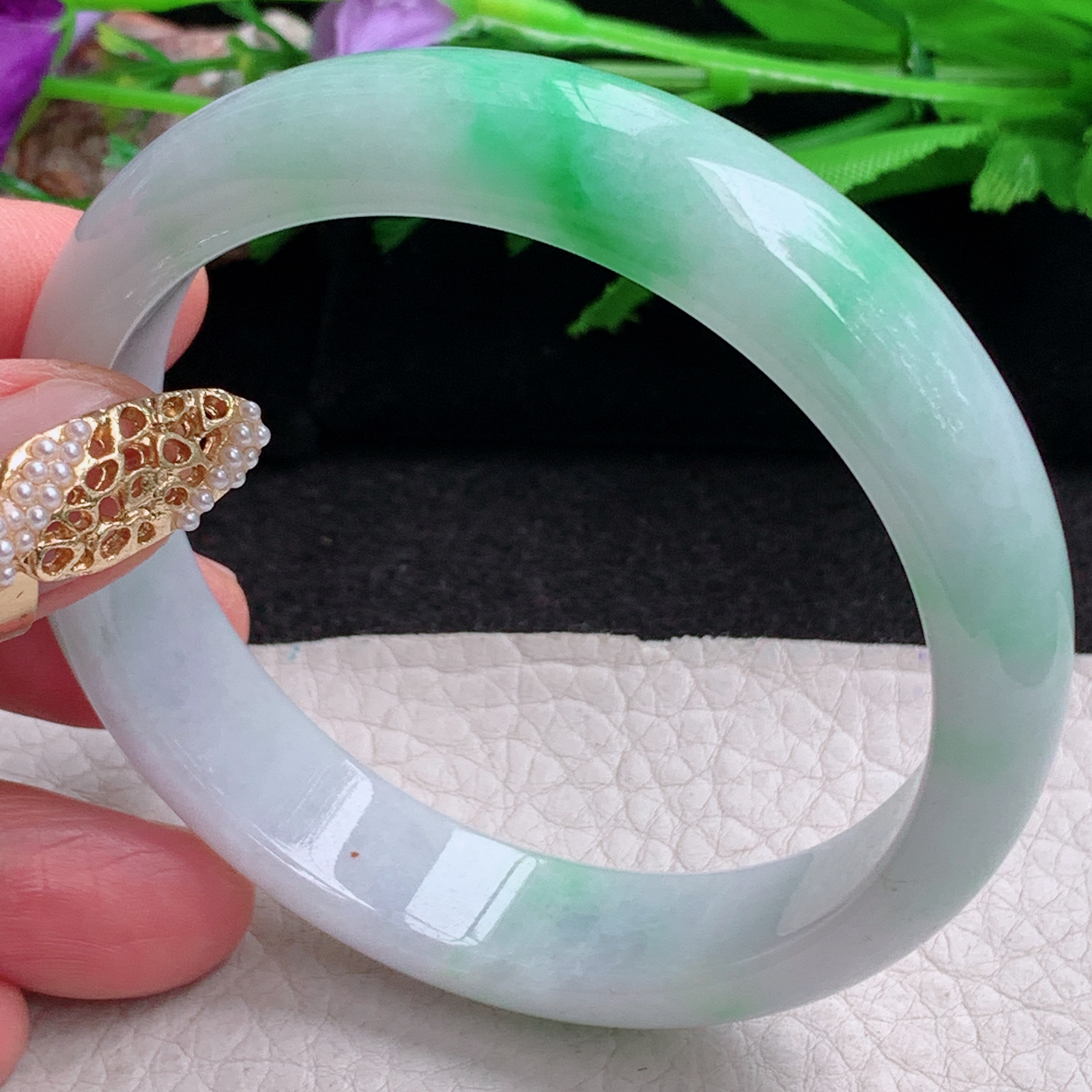 圈口56.3,天然A货翡翠飘花手镯,料子种水好,色泽靓丽,版型好,无纹裂
